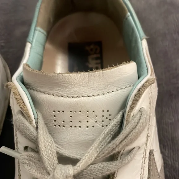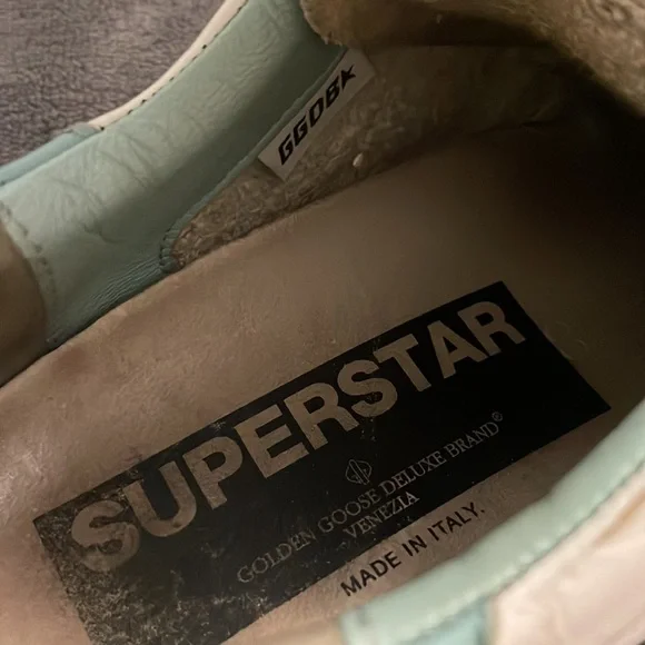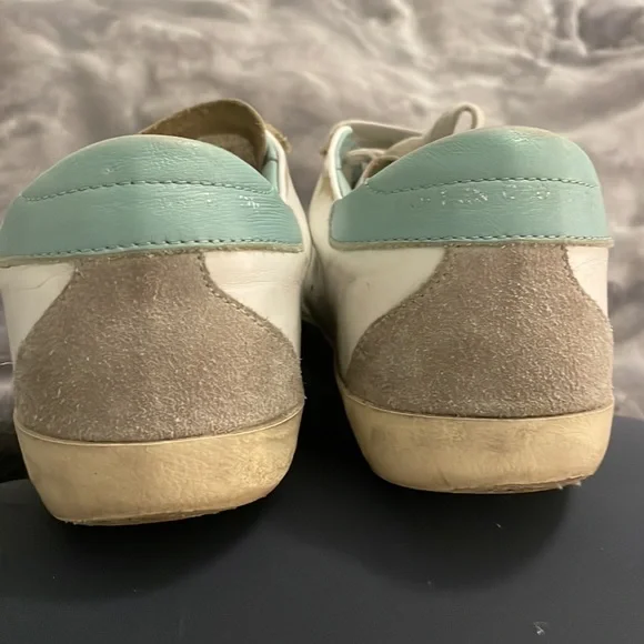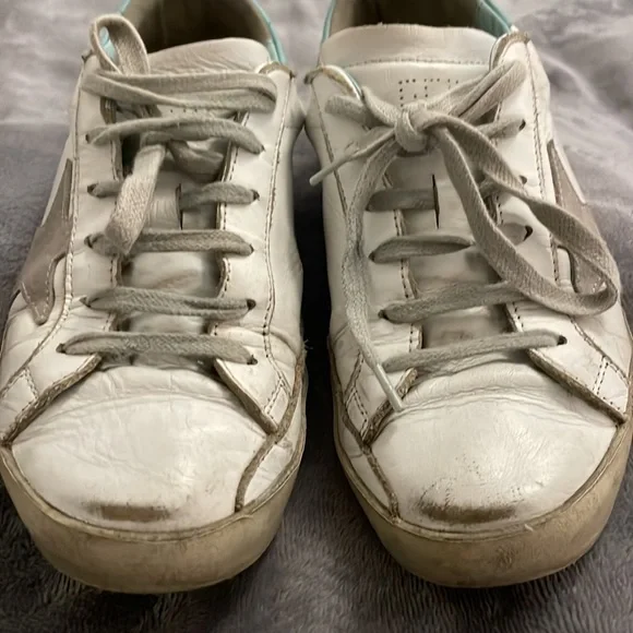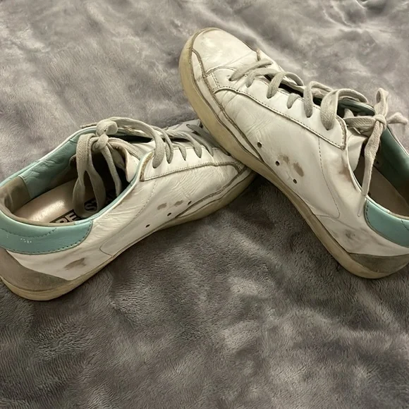 White, gray, and light teal GGDB sneakers. Scuff on soles. Worn insoles.I am a true 6.5 and these fit perfectly.