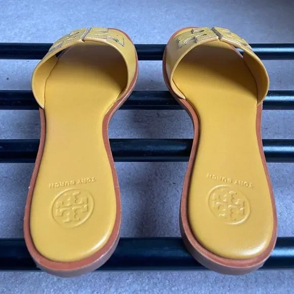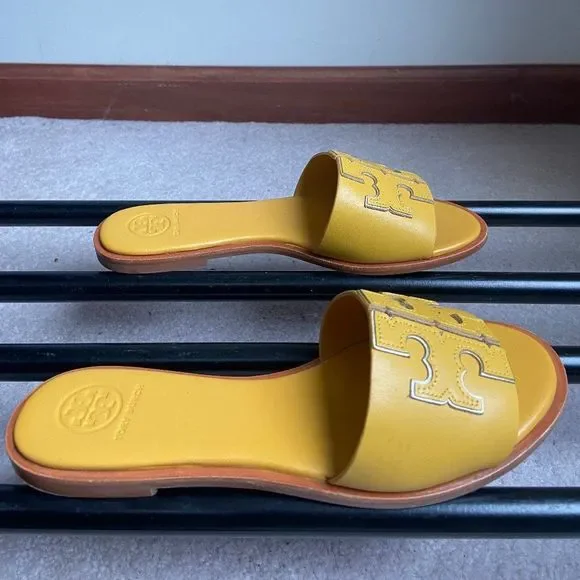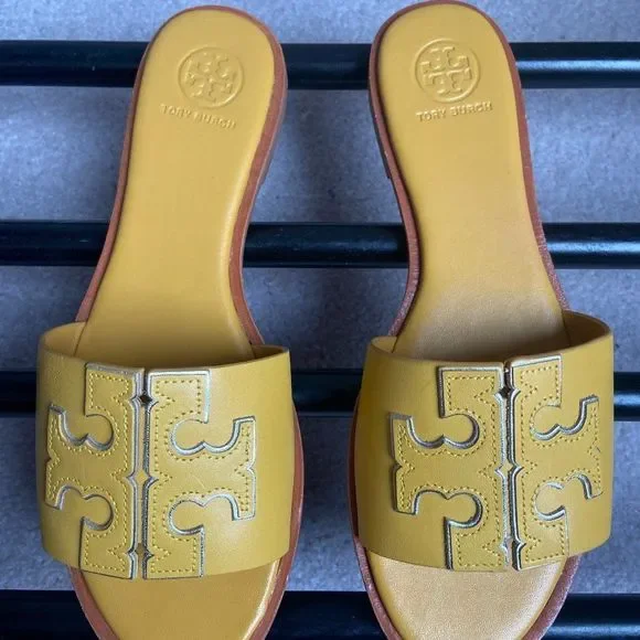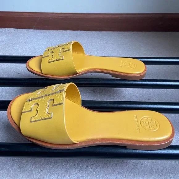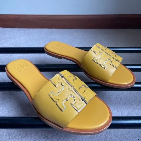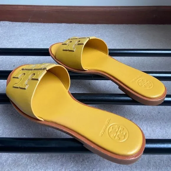 TORY BURCH Women Eleanor Double T Leather Slide Sandals With Silver Metallic Logo - NEW NWOBSize: 7Padded napa leather upper and liningMetallic calfskin trimCushioned insoleSignature emblem at toe strapOpen toeSlip onImportedTrue To Size* Store Display - NEW otherwiseChic comfort. The sport slide is made of soft padded leather that hugs the foot, with a cushioned foam insole for flexible support. The raised Double T is edged in metallic trim for subtle shine. A sleek leather slide accented by Tory´s signature double-T logo is ready to upgrade your warm-weather style.Founded in 2004 in New York City, Tory Burch is an American luxury brand known for timeless pieces and rich storytelling that evokes optimism and joy. Tory is a fashion designer who draws inspiration from her parents’ effortless style, the worlds of travel, art and interiors, and women globally. The Tory Burch collections include ready-to-wear, handbags, footwear, accessories, jewelry, and beauty. Empowering women is the company’s guiding principle, underpinning the design philosophy and company culture, and driving the work of the Tory Burch Foundation.