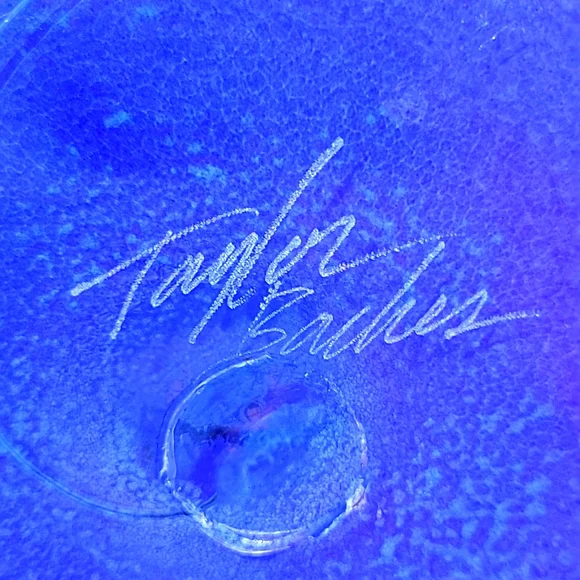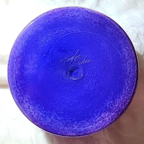 no chips original signed by Taylor Backes hand blown glass 3 1/2inches high8 1/4 inches acrossSmoke free homeTaylor Backes Hand-Blown Cobalt Glass Bowl with Speckled Surface +...