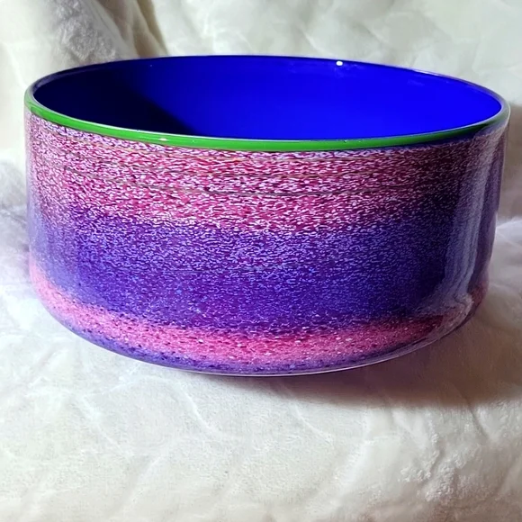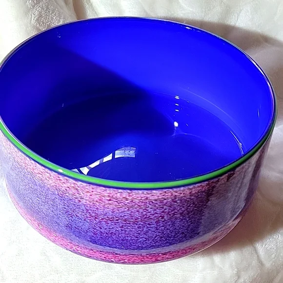 no chips original signed by Taylor Backes hand blown glass 3 1/2inches high8 1/4 inches acrossSmoke free homeTaylor Backes Hand-Blown Cobalt Glass Bowl with Speckled Surface + Contrast Rim, Circa 1983 - 1990s. Postmodern speckled blown glass body in shades of burgundy and light blue with neon green rim and cobalt blue interior. A thin green line swirls throughout the piece. Signed on the underside “Taylor Backes.”“Taylor Backes was conceived in 1982 by Karla Trinkley and Will Dexter. Both of whom were making and showing their work in fine art galleries; however, they wanted to pursue an alternative body of work geared towards the design and consumer market.In order to separate this new work from their personal pieces Taylor Backes, the name derived from the maiden names of their respective mothers, was introduced.” - Taylor BackesCondition: Excellent vintage condition