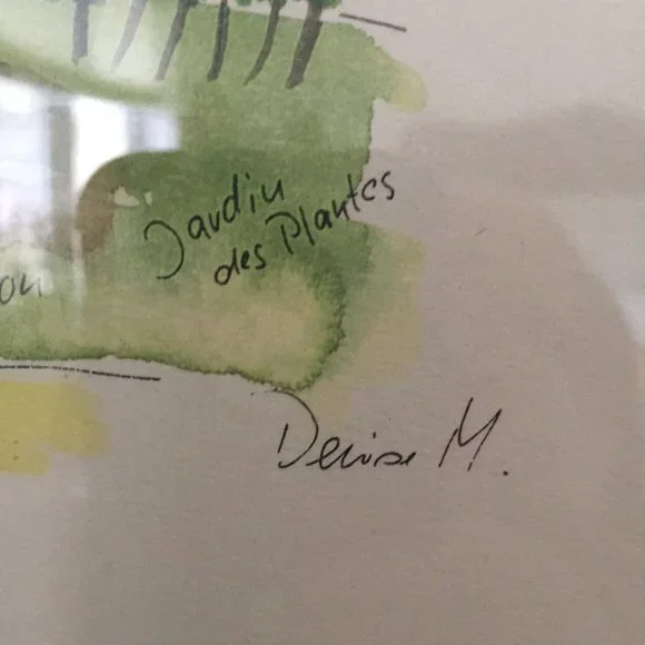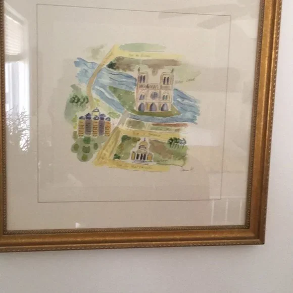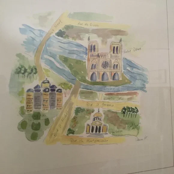 I JUST LOVED THIS PRINT WHEN I FOUND ITLovely original watercolor whimsical map of Paris Centering on Notre Dame and other sites around Beautifully framed in goldSuper fun for a child’s room Measures 12” x 12” unframed and 18” x 18” framed Great condition