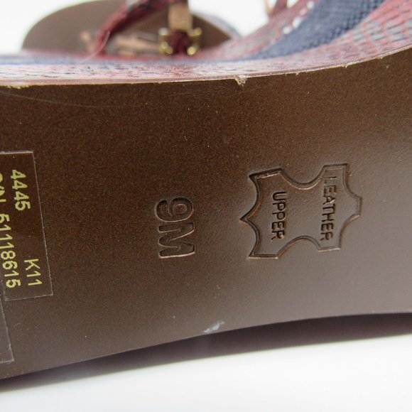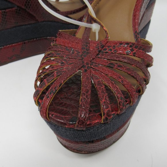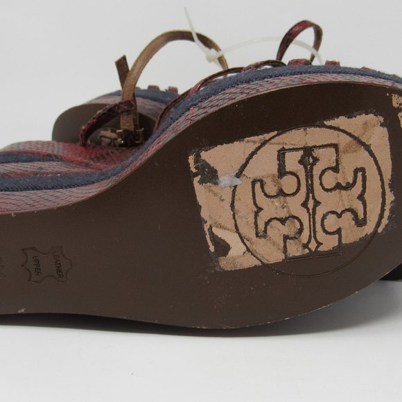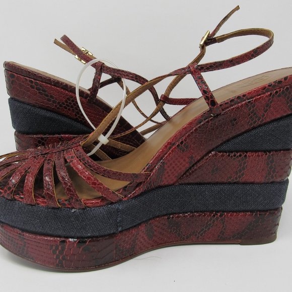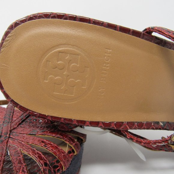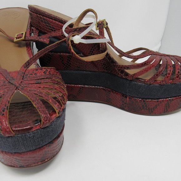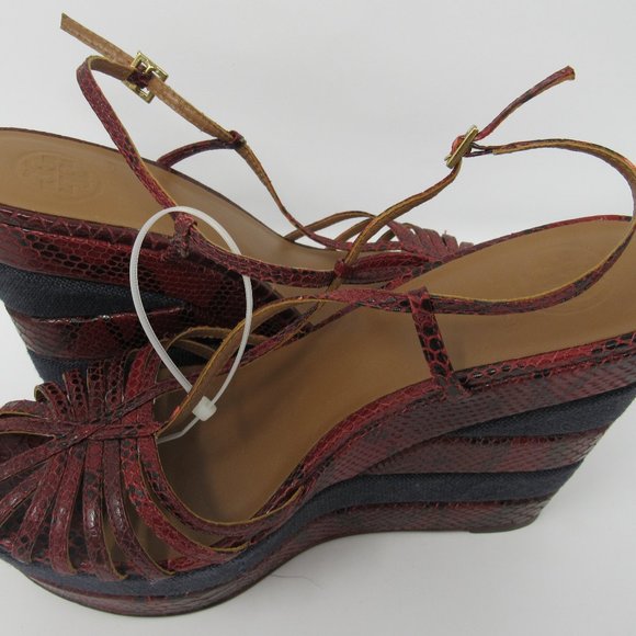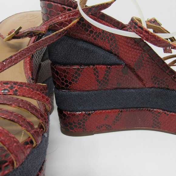 GORGEOUS, NWOT, NEVER WORN wedge sandals by TORY BURCH feature a dark red ´snakeskin´ design with navy blue canvas blocks. Peep-toe design with strappy vamp and gold-tone ankle buckle with adjustable strap. Base Platform Height:2.0"Heel Platform Height: 5.5"SIZE 9; True to SizeLeather Upper; Leather Lining; Leather and Manmade Sole. MSRP: $ 348.00YOURS: $ 235.00