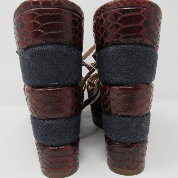 GORGEOUS, NWOT, NEVER WORN wedge sandals by TORY BURCH feature a dark red ´snakeskin´ design with navy blue canvas blocks. Peep-toe design with strappy vamp and...