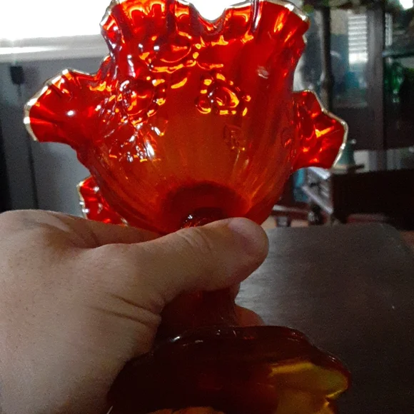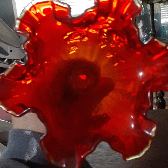 very pretty vintage red amberine Fenton glass footed compote. this is really cool and may be from when glass still reacted to UV.