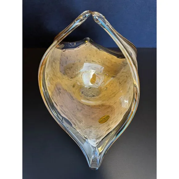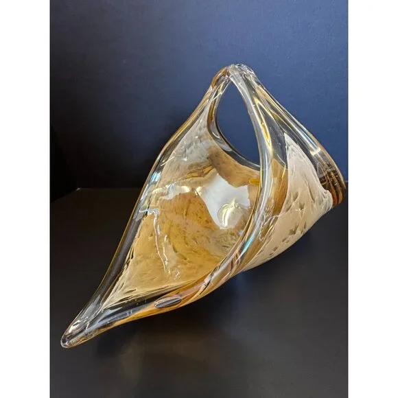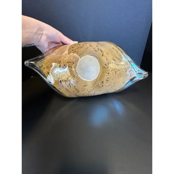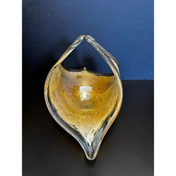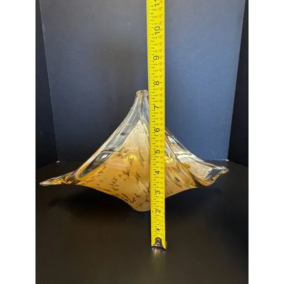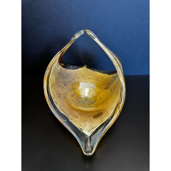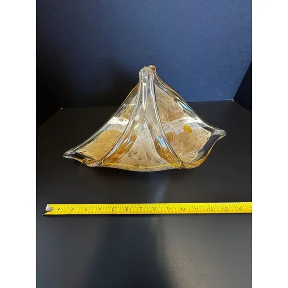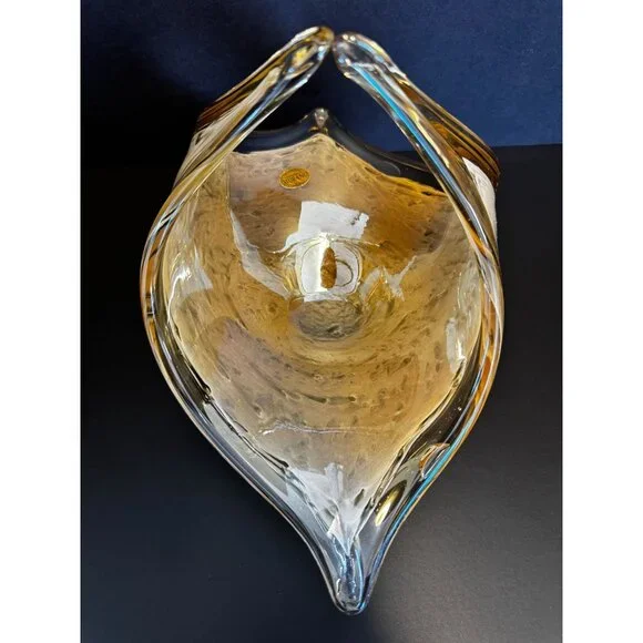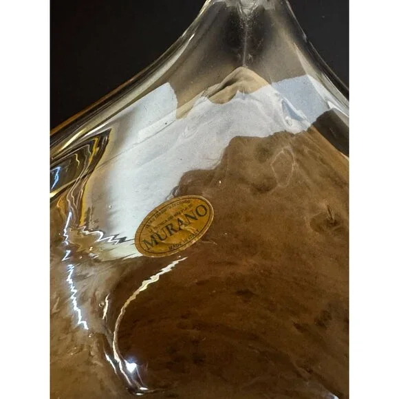 This bowl is so fancy it probably whispers, “I’m exquisite,” while you’re not looking. Elevate your table game with this classy centerpiece.• Handblown glass craftsmanship• Unique amber color with elegant curves• Decorative and functional centerpiece• Authentic Murano design with label visibleNo visible flaws; measurements: length = 13 inches, width = 7 inches, height = 8 inches.