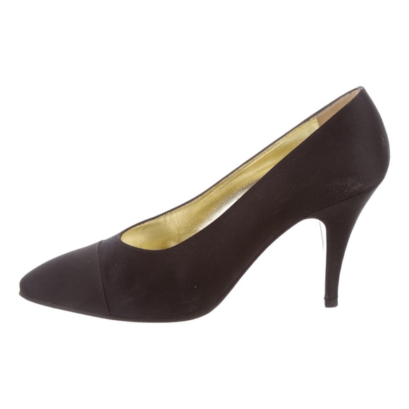 100% Authentic: Pictures shown are actual pictures of the item available for purchase.Black satin pointed-toe pumps with cap-toes and covered heels.Designer Fit: This designer runs narrow and a half size small.Heels: 3.25"Condition: Very Good. Light creasing at exterior; slight discoloration at insoles; light scuffing and residue at soles.