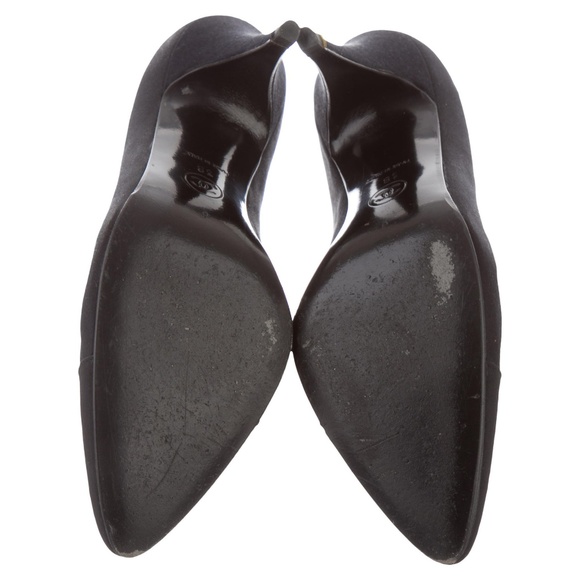 100% Authentic: Pictures shown are actual pictures of the item available for purchase.Black satin pointed-toe pumps with cap-toes and covered heels.Designer Fit: This designer...