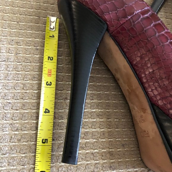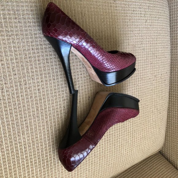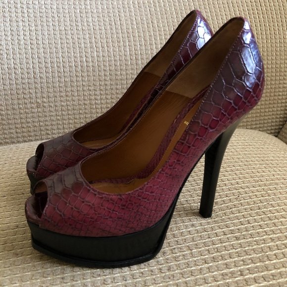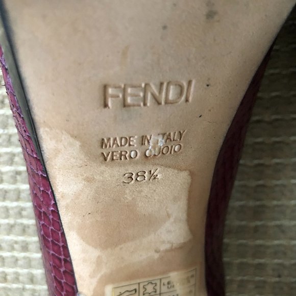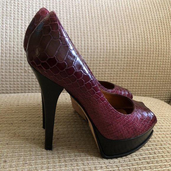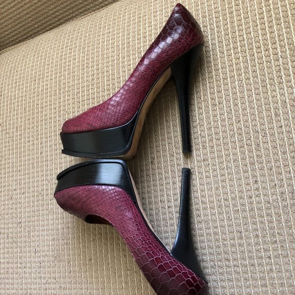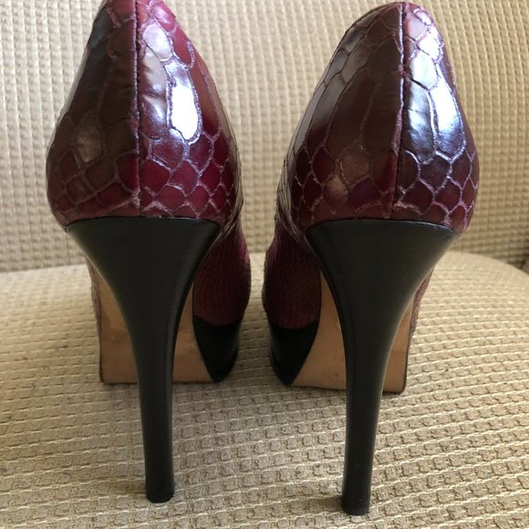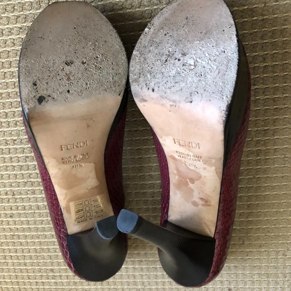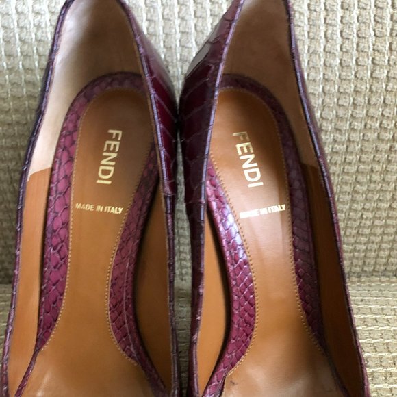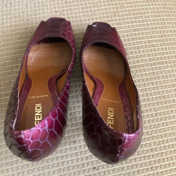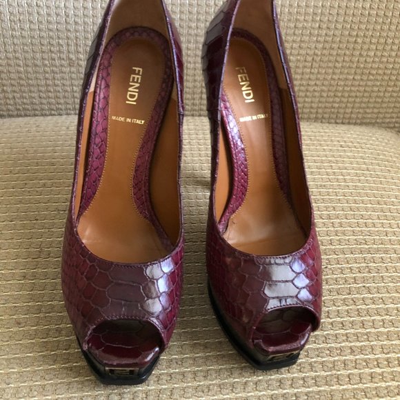 Fendi Women´s Maroon Snake PrintPlatform Open-Toe Heels. Size 38.5/ US 8. In very good condition with signs of use. Shows some scuffs and scratches. Gold emblem shows some tarnishing.
