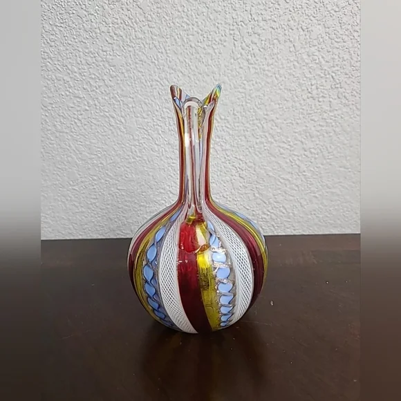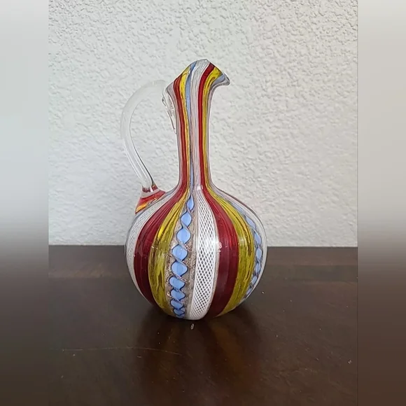 This beautiful pitcher is a truework of art, crafted by skilledglassblowers in Murano, Italy. The piece features exquisite ribbon and latticino designs, showcasing the remarkable talent of the artisans who created it. Made fromhigh-quality art glass, this pitcher is a unique addition to any collection.Its vintage charm and multicolored finish make it a standout piece, perfect for display or use. Whetheryou´re a collector of Murano glass or simply appreciate the beauty of handcrafted art, this pitcher is sure to impress
