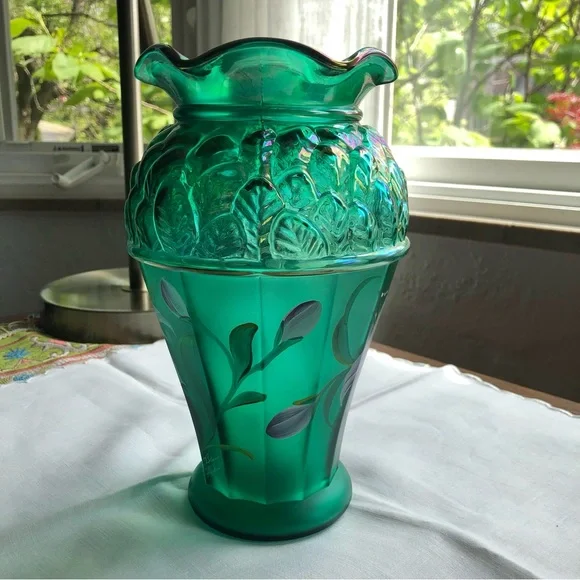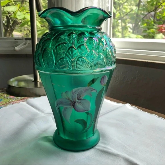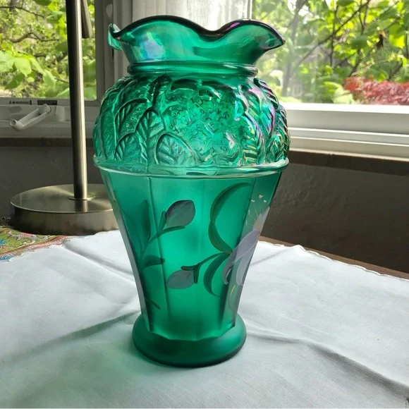 Fenton emerald green vase with purple lillies designer series hand painted excellent pre loved condition Elegant Collectible Ruffles Art glass
