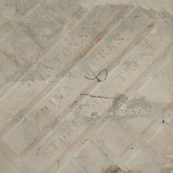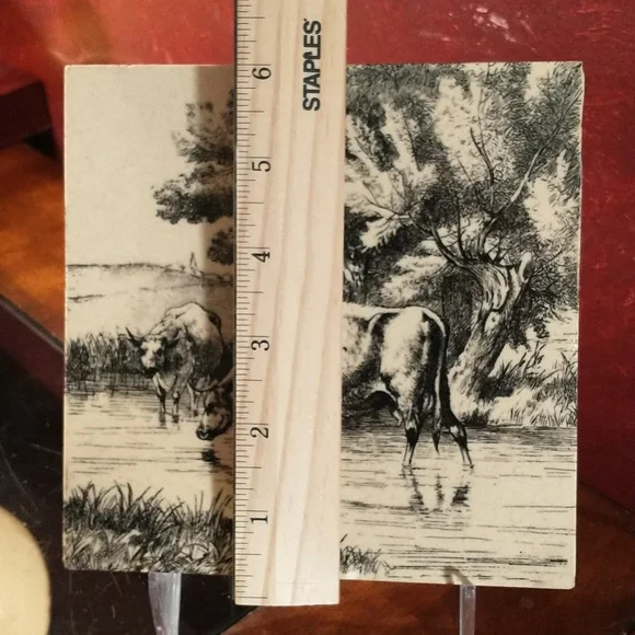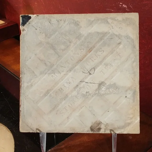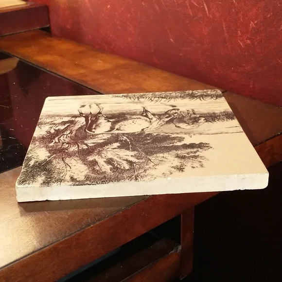 H11 - A Nice English Victorian tile by Mintons in the farm animal series designed by William Simpson and made in the 1880´s.This tile shows two cows in a stream with a tree and pasture in the background. The black transfer is on a cream colored base. Measures 6" x 6" x 1/2". Good, shiny surface.Scattered flakes around the edges.