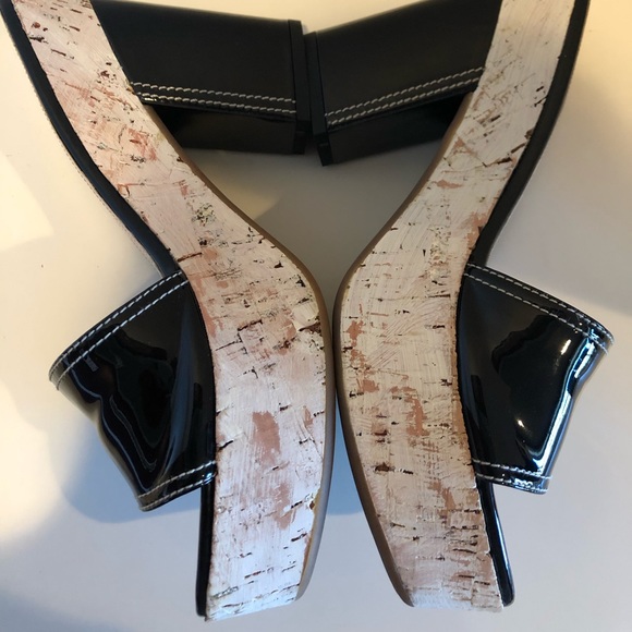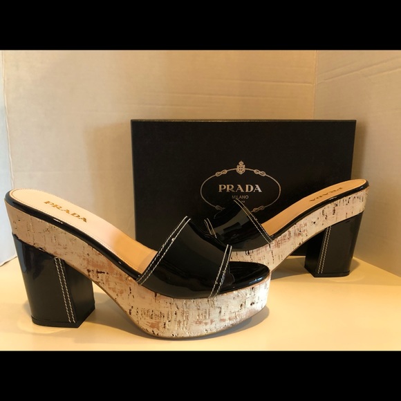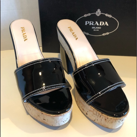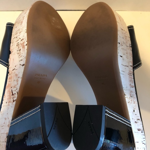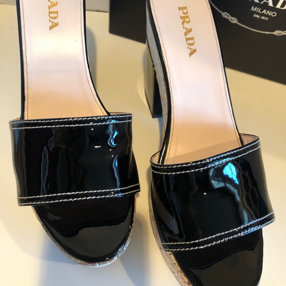 Prada Cork Sandals Size: 40 Color: Black and beige Condition: Excellent! Only worn 2 times. No markings, no stains, no damage to the leather. No signs of wear in heel. No flaws. Details: Super cute and fashionable Slip on Sandals. Shinny patent leather with cork design on sides. Super comfortable. Pictures don’t do justice! They are stunning! Comes with box and both dust bags.