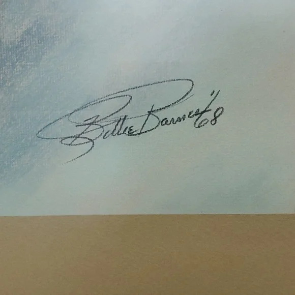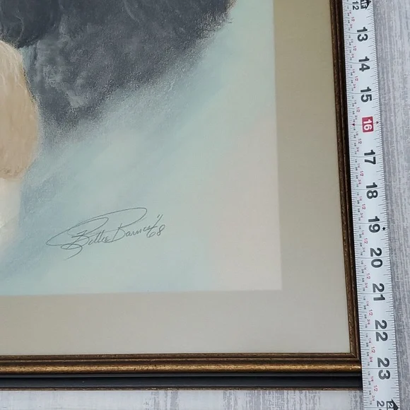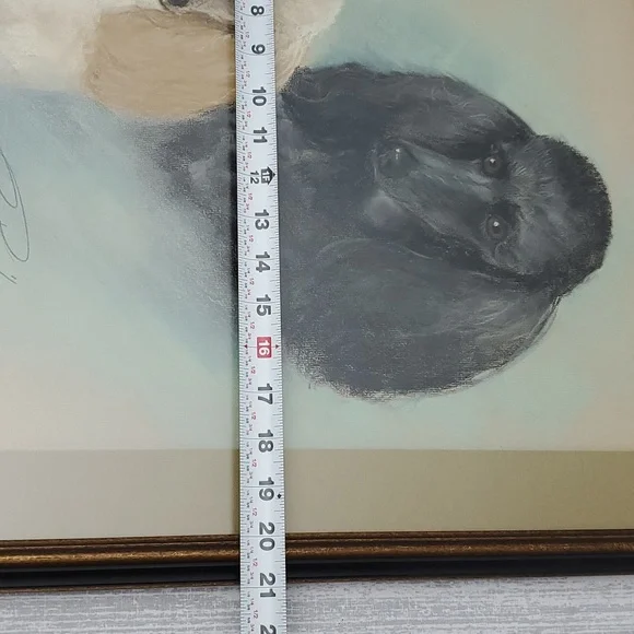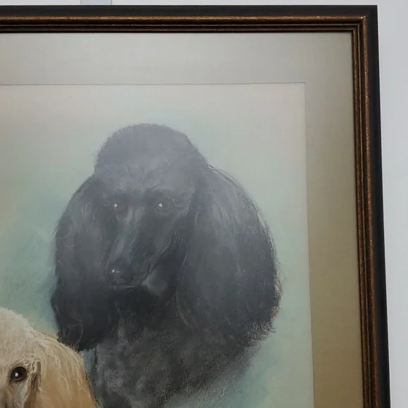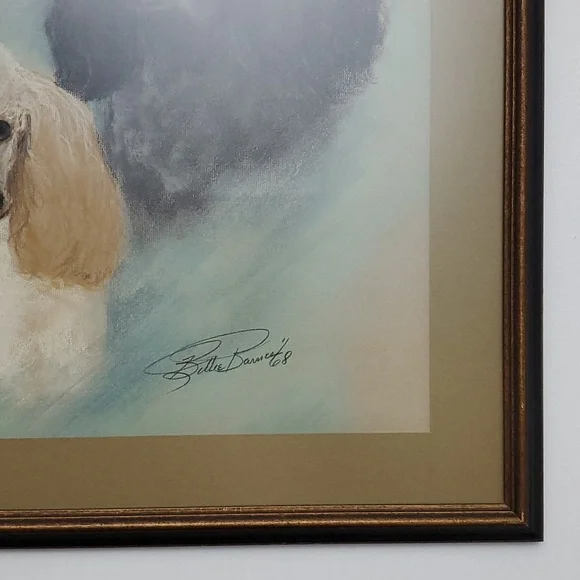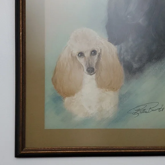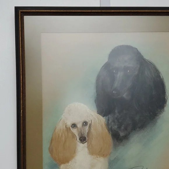 Large Vintage Art "Perfect Poodles".Original Hand drawn art in 1968 by artist Billie BarnesProfessional framed with matte and matte glass covered. Dark wood in gold and black trim.See pics for measures and details.Smoke and pet free home.