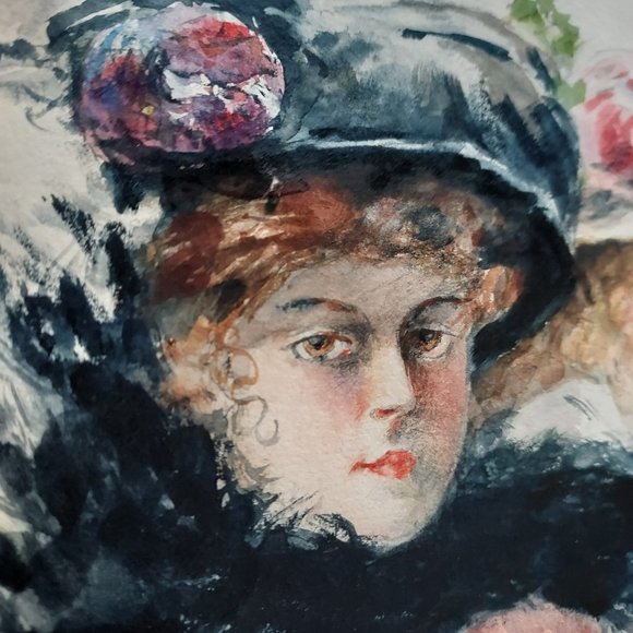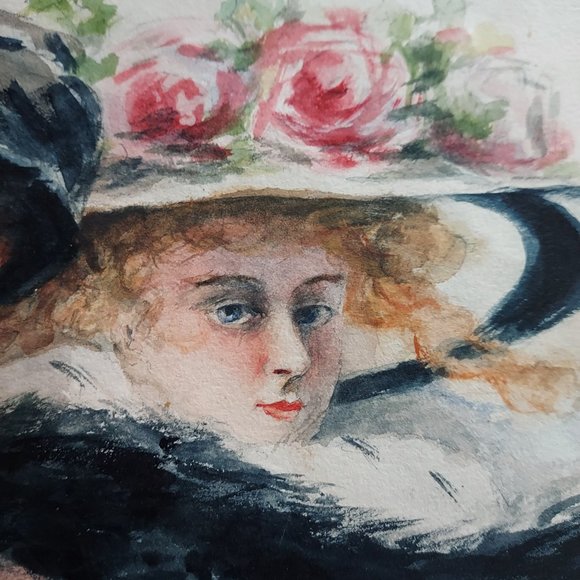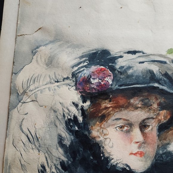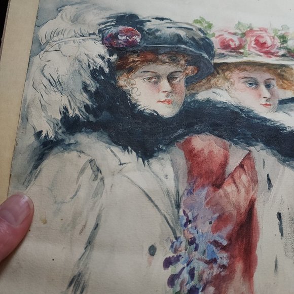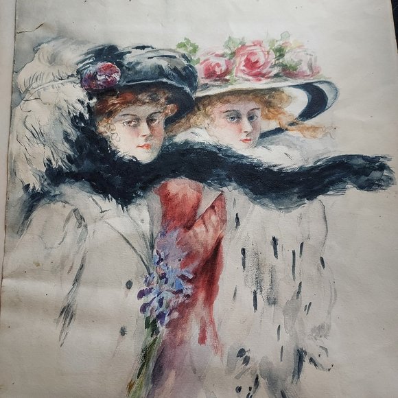 11x14 Vintage original watercolor of two Gibson Girls with full fur scarves and flower hats with feathers adorning them this image is outstanding in its beauty and color. It is out of its frame and will be mailed between two foam boards to insure its safety upon arrival. In good condition for its age. This is unsigned that I can tell but simply beautiful.Some water stains on the bottom and some wavy wrinkles throughout see pictures for more details.