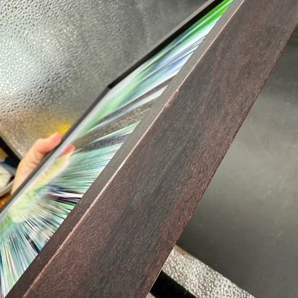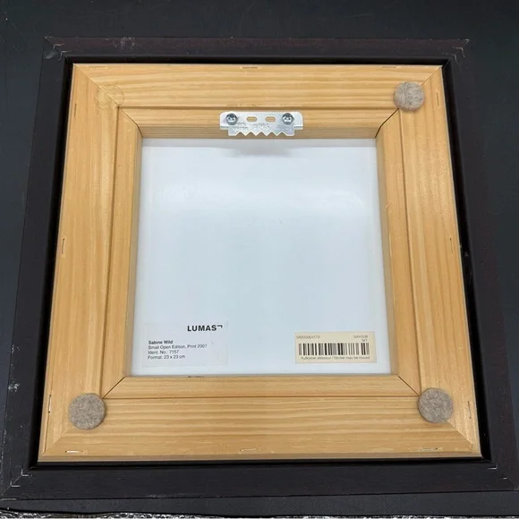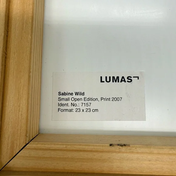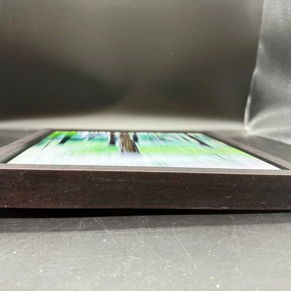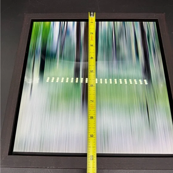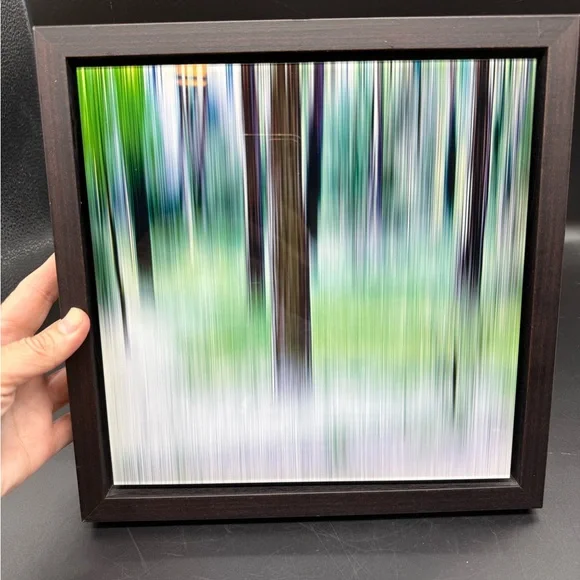 The image shows a framed photograph by Sabine Wild, likely from her "Woods" series. The photograph features a blurred, abstract depiction of trees in a forest, rendered with vertical lines and a palette of greens, browns, and hints of yellow. This technique is characteristic of Wild´s work, where she captures landscapes and architecture in patterns of lines, shapes, and colors, often dissolving the subject into abstraction. Sabine Wild, born in 1962 in Italy, is a freelance photographer currently based in Berlin. She is known for her abstract and painterly approach to photography, often focusing on landscapes and architectural subjects. In her "Woods" series, Wild uses long exposure and movement to transform realistic scenes into abstract compositions, challenging the viewer´s perception of reality. Light scratches on glass, it doesn’t take away from its beauty.