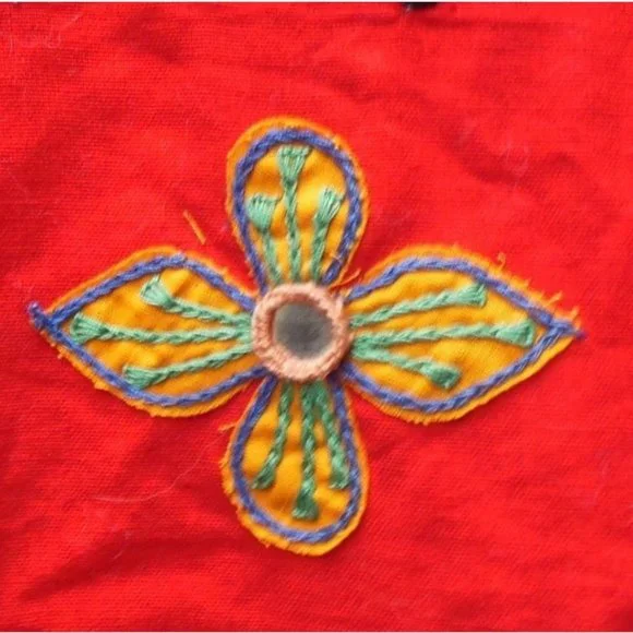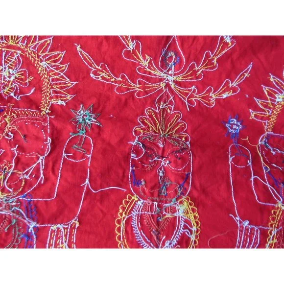 Hand Sewn Pipili Chandua Applique Wall Hanging Depicting Lord Jagannath, Balabhadra, and Subhadra. deities worshiped in regional traditions of Hinduism.The Pipli Applique folk art owes its origin to Lord Jagannath culture during 12th century. The work is created in or near the village of Pipili in the state of Odisha in Northeast India.The wall hanging is hand cut and sewn from cotton cloth and thread, and is embellished with embroidery, mirrors, and sequins. It measures 29 inches x 44 inches.Excellent used condition. No holes or wear. The stitching is tight and the colors are unfaded. Please see photos for condition details.Thanks!