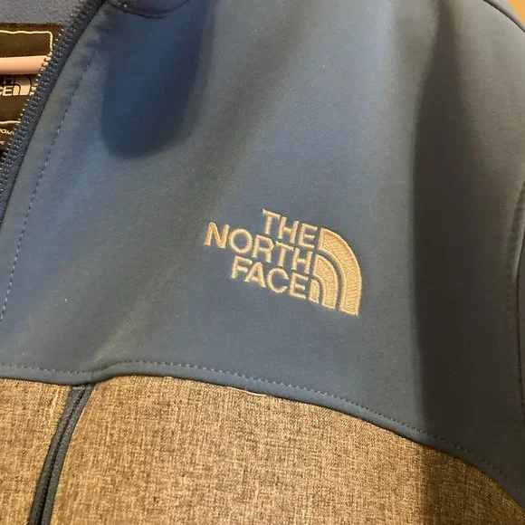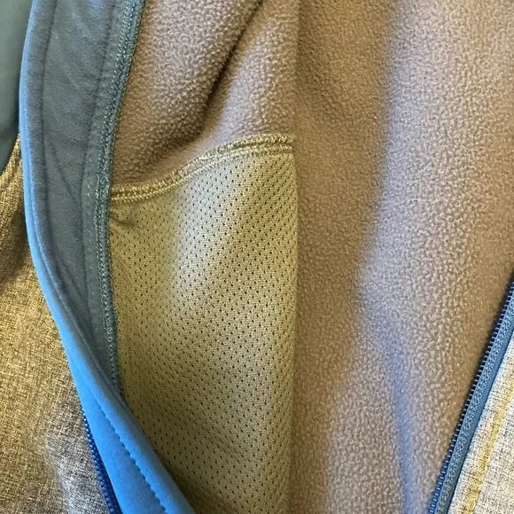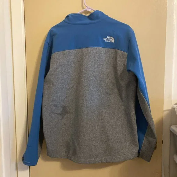 North Face Men´s Jacket in Gray and Blue. Thicker than a Lightweight Jacket, but not a Coat. Can cinch hemline. Big Side Pockets and Chest Pocket. (some stains in back).