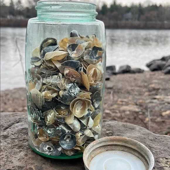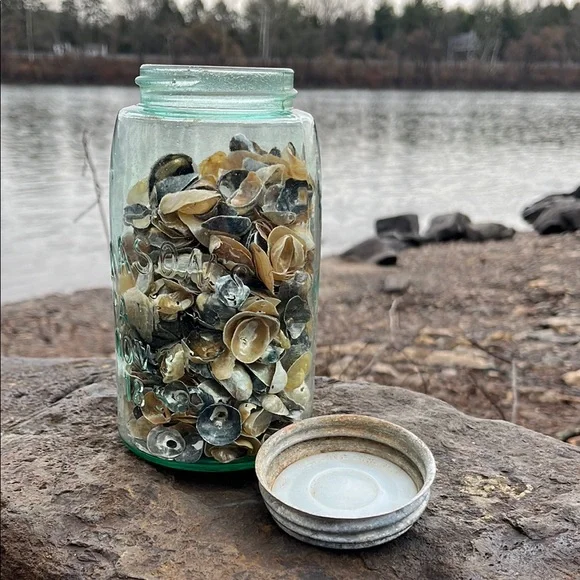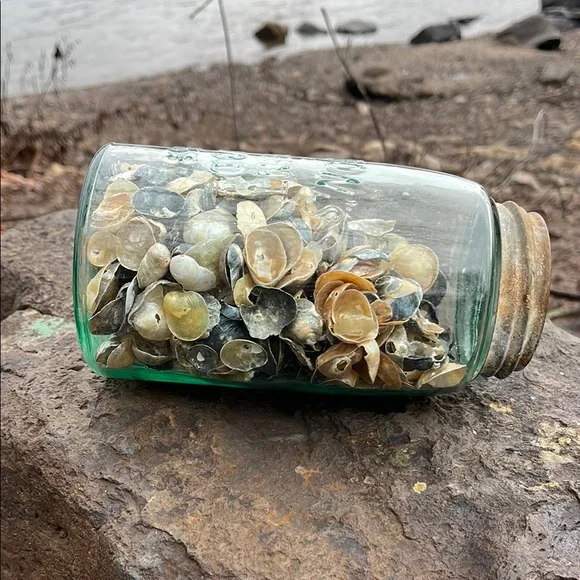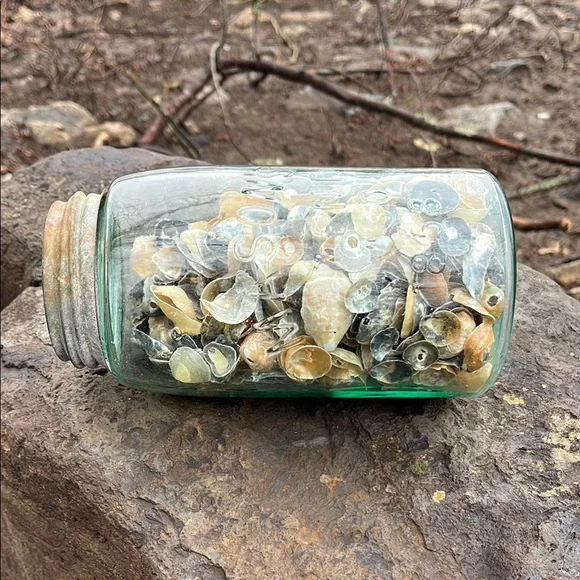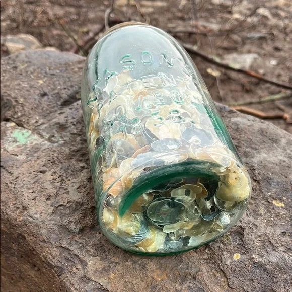 Beautiful ANTIQUE sea green MASON JAR by the Ball Brothers. Made in true USA. It is filled with assorted coin shells from the NJ coast of the Atlantic Ocean. Display the glass jar in a window for a beautiful cast of sea green for home decor or simply display as is. I personally would make a neat 3-D shell flower display on canvas and sell the jar on EBay bc it is a RARE MASON Jar complete with neat seed bubbles a # 3 under the word MASONS and the green vs blue is more rare than your typical ball blue. Offers always appreciated & welcomed!