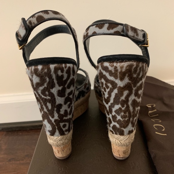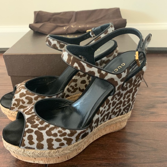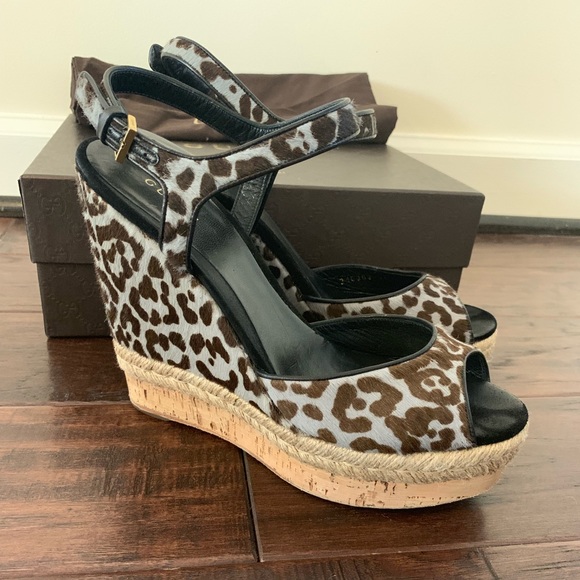 Delicately WornLeopard-print dyed calf hair (Nuova Zelanda Australia)Adjustable ankle strapPeep-toeWedge features calf hair, jute trim, and cork5 1/2" heel with 1 1/2" platformDust bag included