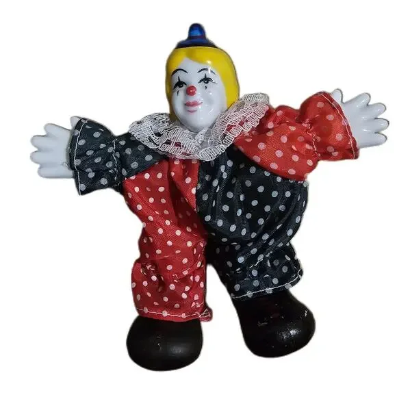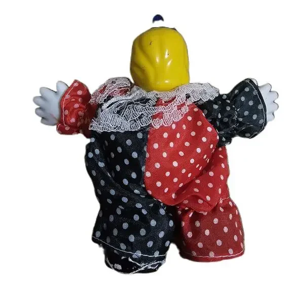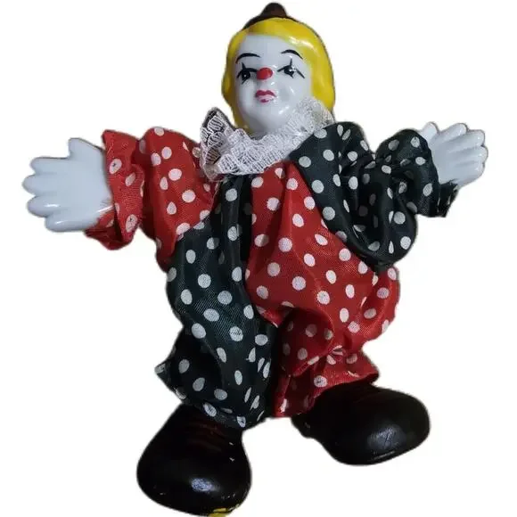 Multicolor Porcelain Head Polka Dot Outfit Lace Collar Clown Doll SetThis charming set of clown dolls showcases unique polka dot outfits and lace collars. Crafted with porcelain heads and bendable fabric bodies, these figurines are a delightful addition to any collection.Condition: Good condition.Size:Features: Polka Dot Outfit, Red and Black Color Scheme, Lace Collar, Fabric BodiesBrand:Type: DollStyle: ClownColor: MulticolorMaterial: Fabric, PorcelainMeasurements:See pictures.Keywords: Vintage, Circus, Teen, Figurine, Handmade, Original, Set