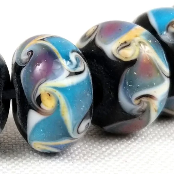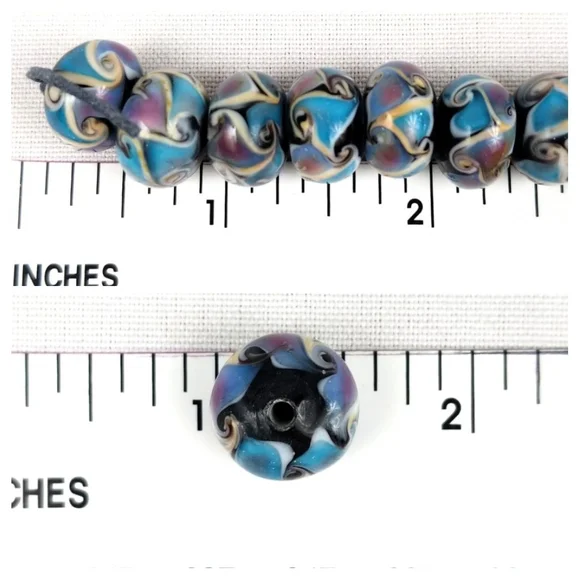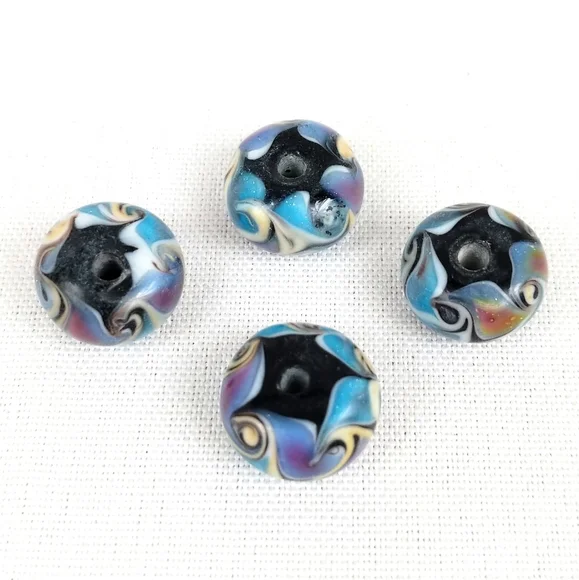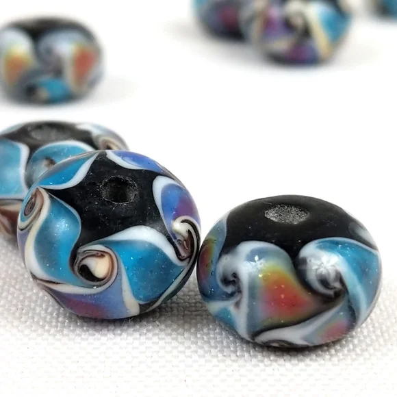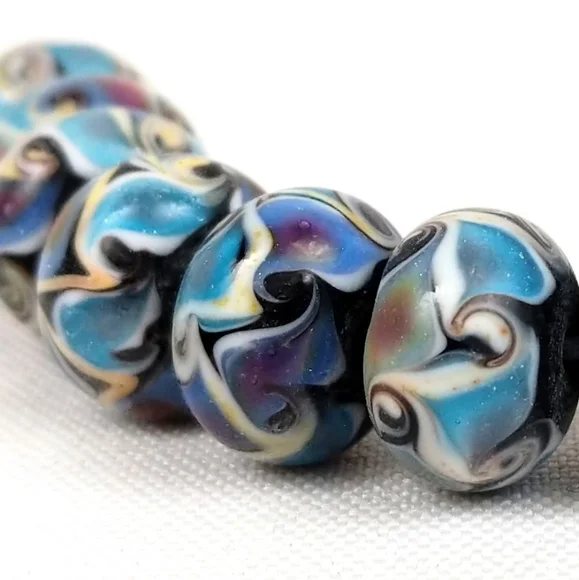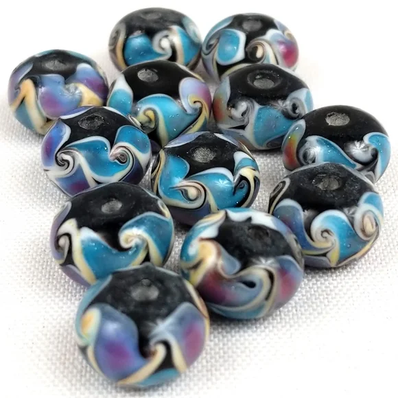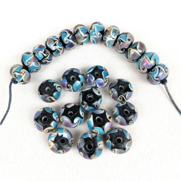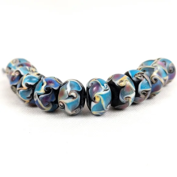 Handmade Lampwork Glass Beads Swirl Pattern Shimmer Blue Black Set of 24 NWOT