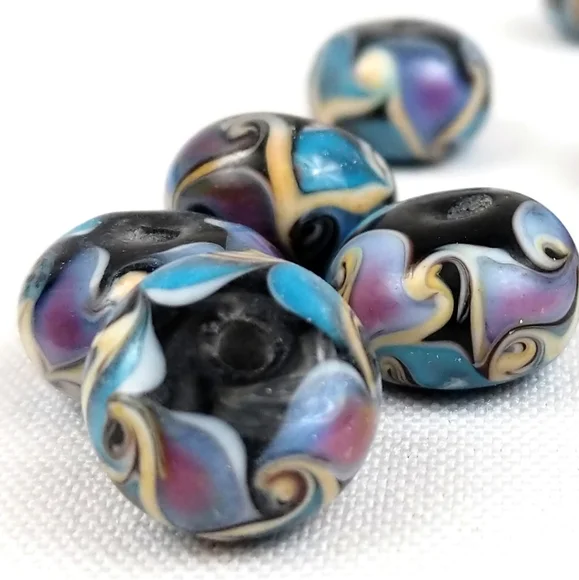 Set of 24 handmade lampwork glass beads. Swirls of blue, lavender, and black with hints of white, orange, peach, and yellow. There´s a bit of iridescent shimmer throughout....