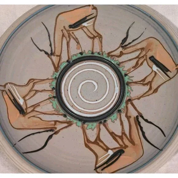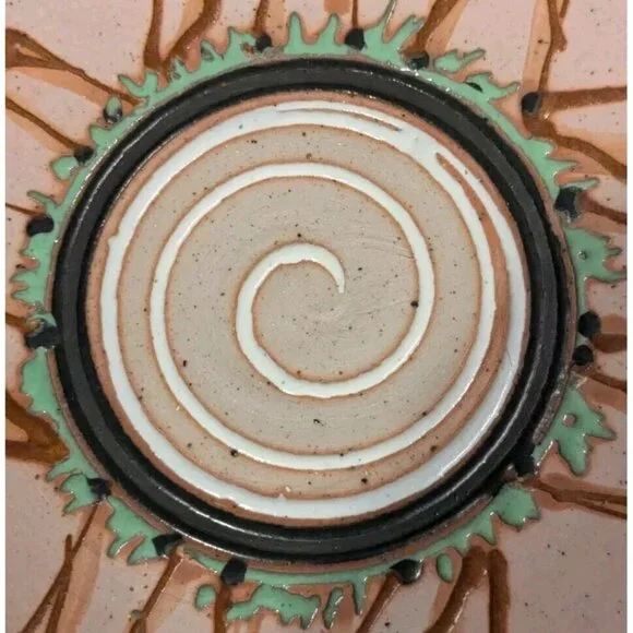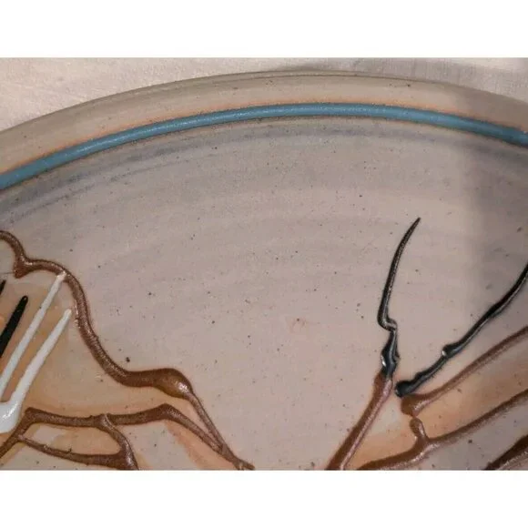 Vintage Donn Hedman Studio Pottery Platter.Painted Gazelles surrounding a swirl in the middle.Stoneware.Hand painted.Decorative ceramic art plate.Approximate diameter is 10 inches. Artist Mark on the bottom of the platter.Pre-owned. One small chip on the bottom of the plate. Please view pictures included in this listing for a visual description of the item and condition.