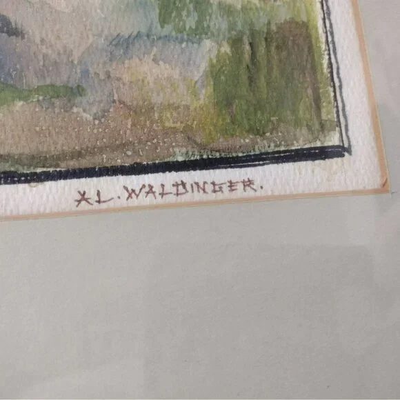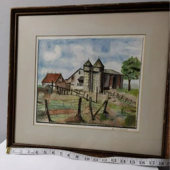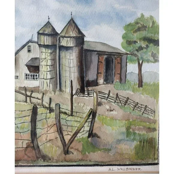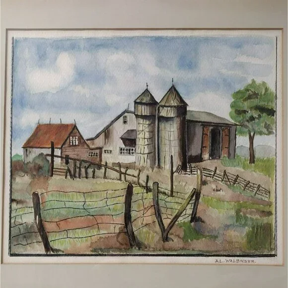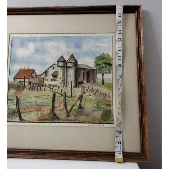 This vintage watercolor painting signed by A.L. Waldinger (or Al Waldinger?) captures a serene barn / farm scene. It is matted, fronted with glass, and has a solid wood distressed rustic frame which nicely complements the artwork. A fine addition to vintage, rustic, country or farmhouse decor, offering timeless charm.• Artwork by A.L. Waldinger• Watercolor technique• Rustic wooden frame• Ready to hang with wire back• Farm scene depictionMeasurements: 19 inches wide, 17 inches tall.Features:Rustic, Farmhouse, Vintage, Original Artwork, Barn PaintingUnited StatesMeasurements:width 19 undefinedheight 17 undefinedCondition: Pre-Owned GoodOverall in very good vintage condition. There is a bit of wear to the frame, some peeling of the brown paper backing, and a bit of sun fading on the matting.