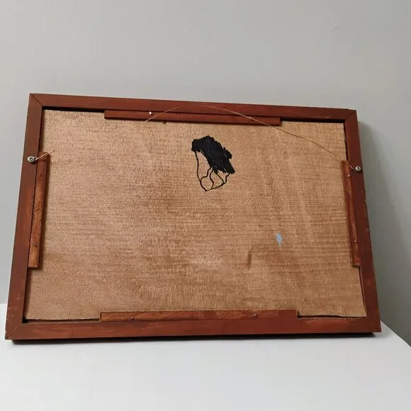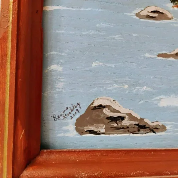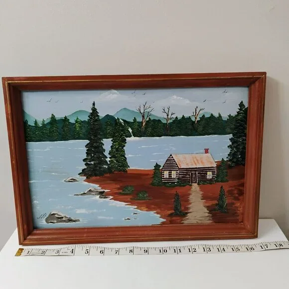 Lovely hand crafted oil painting signed by the artist, showcasing a serene cabin by the lake surrounded by lush trees and mountainous scenery, framed. A nice addition to a rustic lake cottage decor.• Hand-painted original oil painting on wood• Signed by artist and dated 2009• Framed with a sturdy wooden frame• Measurements: 17 inches x 12 inches• Ready to hang with attached wireFeatures:Rustic, Cottagecore, Handmade, Lake Cottage Wall Art, Original Oil PaintingMeasurements:Width 17 inHeight 12 inCondition: Pre-Owned GoodOverall in very good pre-owned condition.The frame has a few small scratches. Some black marker marks on the back.