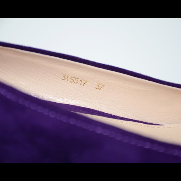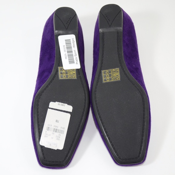 Authentic Prada purple suede square-toe loafers. Condition new and never worn, including dust bag. Heel 0.5". More detail pictures @ www.thevluxe.com