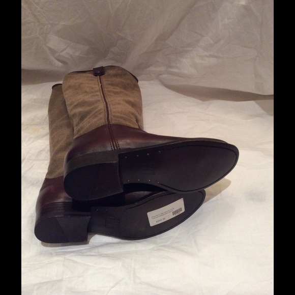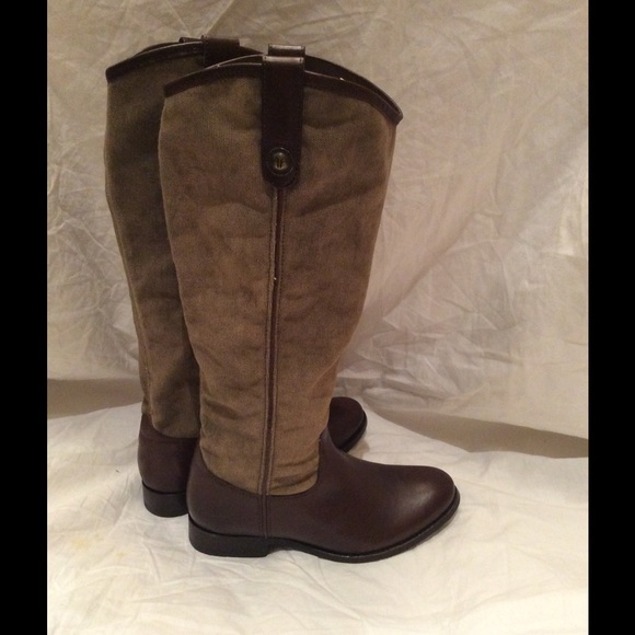Frye Melissa Brn Western Style Boot Size 6 canvas top and leather bottom. Two tone brown knee high