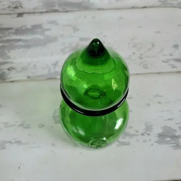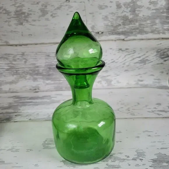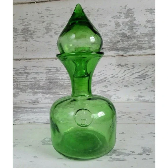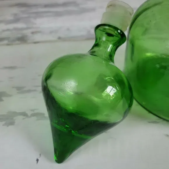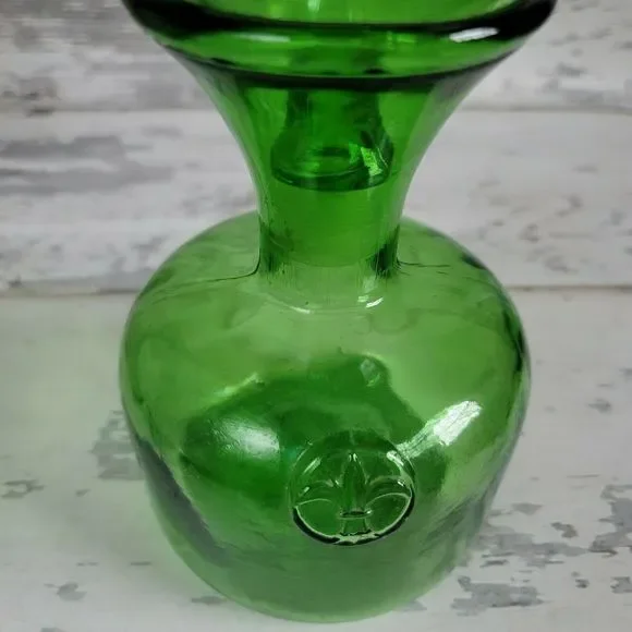 Vintage Italian Empoli green glass blown decanter, fleur-de-lis accent, teardrop. Absolutely gorgeous deep green vintage Empoli decorative glass bottle decanter with large teardrop shaped, bulbous stopper. The bottle has a round wide base and thin neck that flares to a wide shape at the top where the stopper sits. The glass has texture and some air bubbles here and there, typical of hand blown glass. The front of the bottle has a small fleur de lis design that slightly protrudes from the front of the bottle. The bottle measures 11" high with stopper in, bottle alone is approximately 7.5". Mid 20th century time frame. This bottle is in nice vintage condition with no chips or cracks.