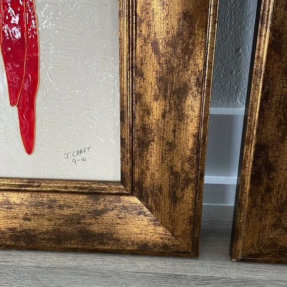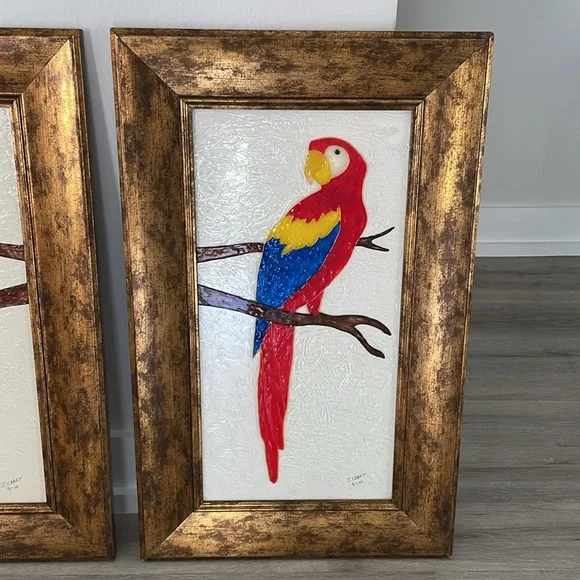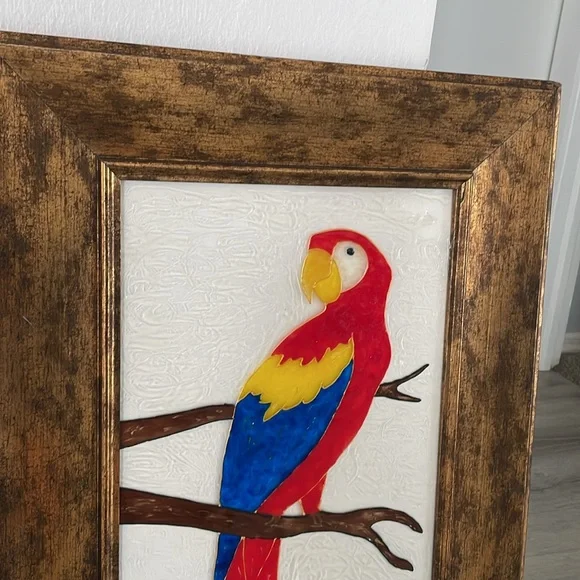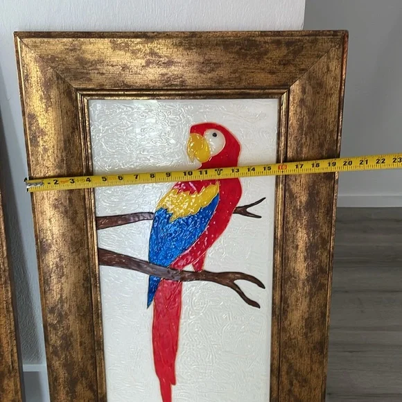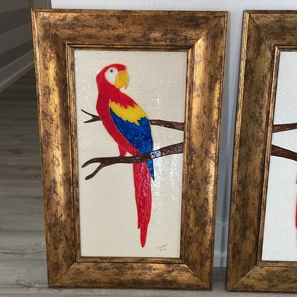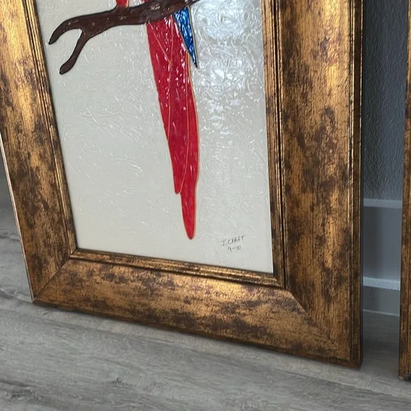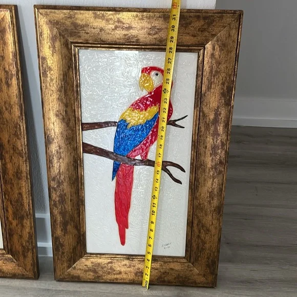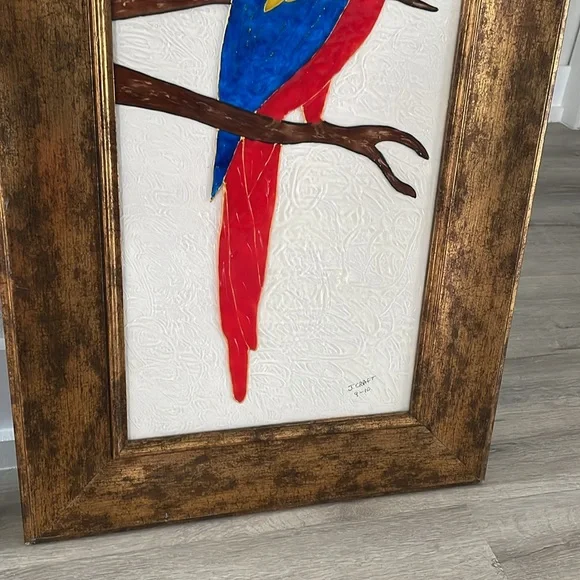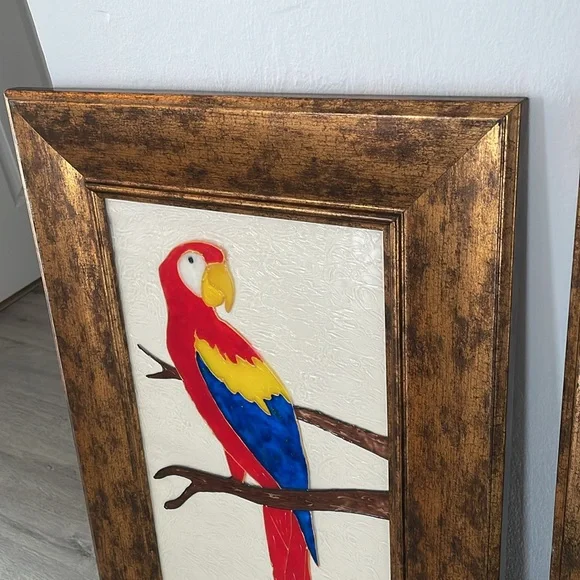 Handcrafted Stained Glass Macaw Parrots 32x19 inches Bronze Framed Art J CraftGreat Condition