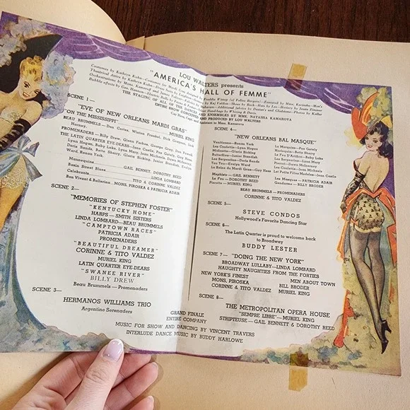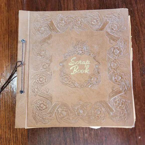 1950s? era wedding and honeymoon scrapbook from a family in upstate New York. Includes cards, travel memorabilia and more! 30+ pages. Crumbling page edges, yellowing, loose pages, wear and tear on cover.