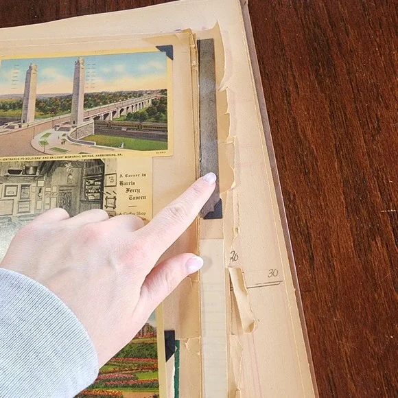 1950s? era wedding and honeymoon scrapbook from a family in upstate New York. Includes cards, travel memorabilia and more! 30+ pages. Crumbling page edges, yellowing, loose pages,...