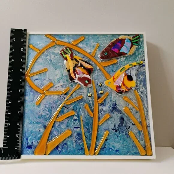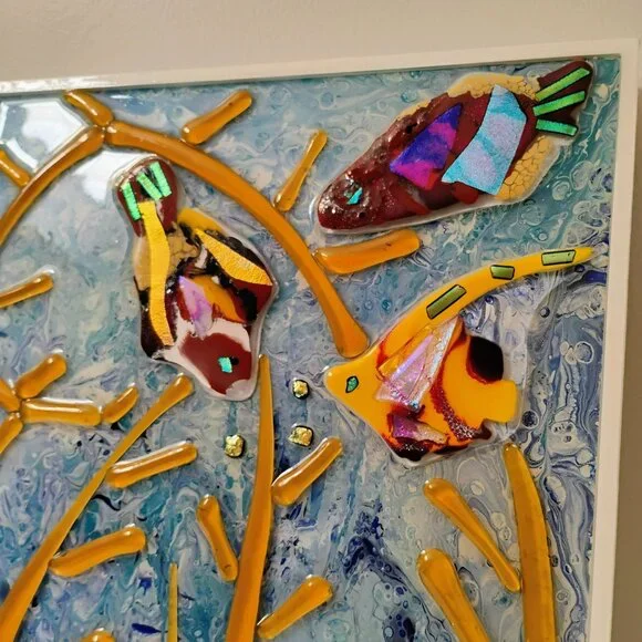 This original fused glass collage artwork titled "Acquiring The Sea" features a vibrant mix of abstract fish and coral, offering a unique centerpiece for any space.• Measures...