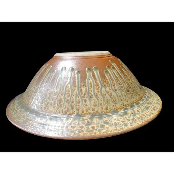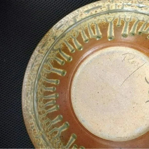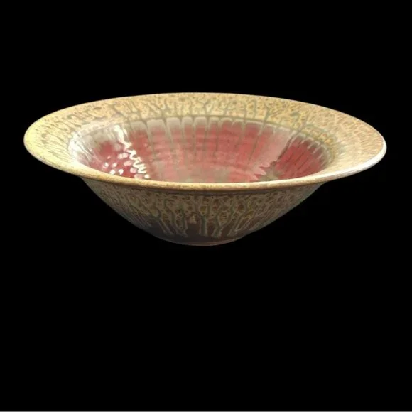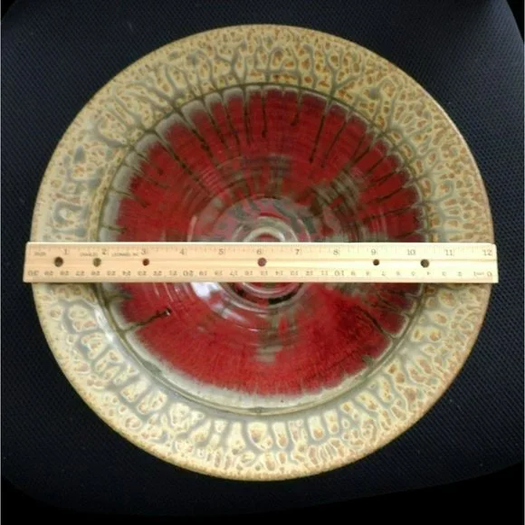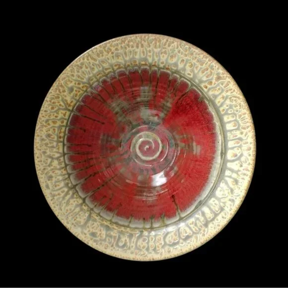 A stunning handcrafted ceramic bowl by North Carolina potter Paul Ray of Seagrove NC. It is expertly glazed in oxblood red and ash beige tones, ideal for serving or as a decorative centerpiece. Measures 12 inches in diameter. Signed "Ray" on the underneath.• 12-inch diameter signed pottery bowl• Hand-thrown and glazed• Unique spiral detail in the center• Durable ceramic construction for long-lasting use• Artisan-signed baseRay Pottery is handcrafted in historic Seagrove, NC where pottery has been made since the late 1700’s. This piece is made by the husband and wife team of Paul and Evelyn Ray whose goal is to enhance the celebration of daily life and enrich its simple joys. Their pottery is designed to be used in the oven, microwave, and dishwasher.Each piece is finished with a lead-free glaze that is safe for food use. Features:Handmade, Carolina Pottery, Seagrove NC, Art Pottery BowlUnited States (North Carolina)Measurements:Width 12 inCondition: Pre-Owned GoodIn excellent pre-owned condition with no chips, cracks or repairs.