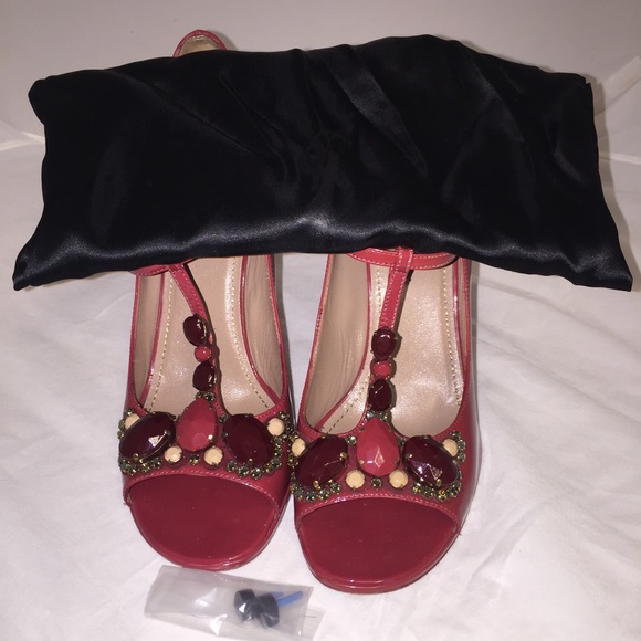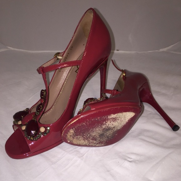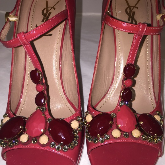 Yves Saint Laurent, T-Strap, 4 1/2", Vitello Vernice Soft Rouge w/stones, dust bag, worn.