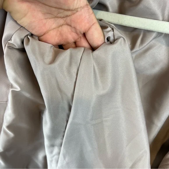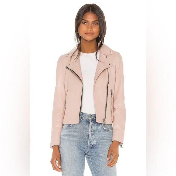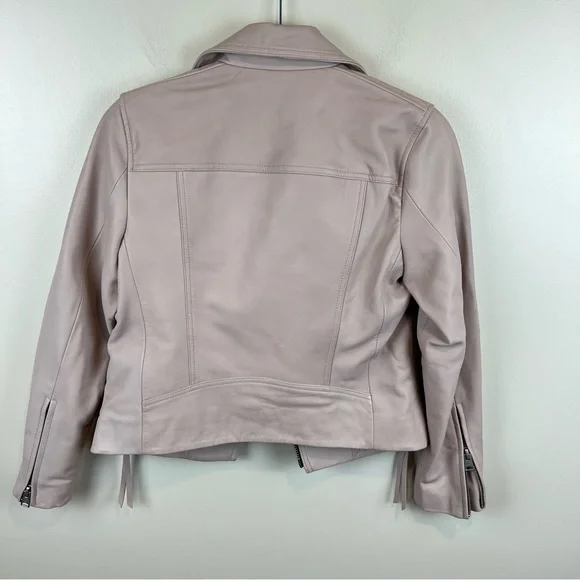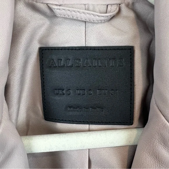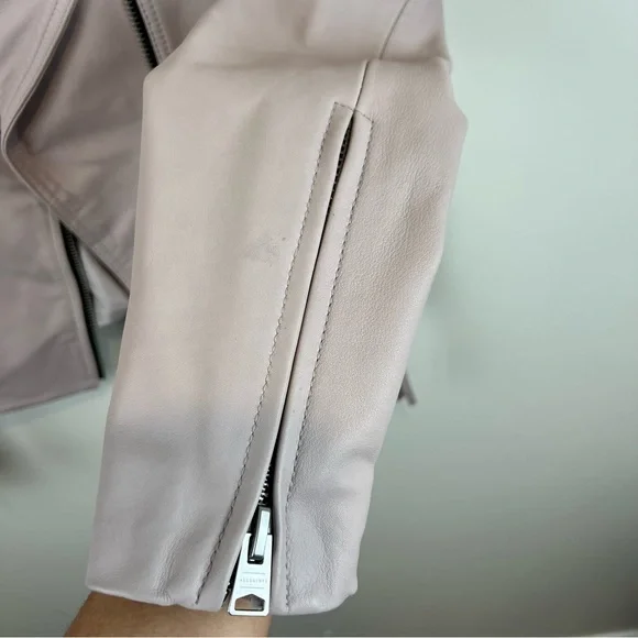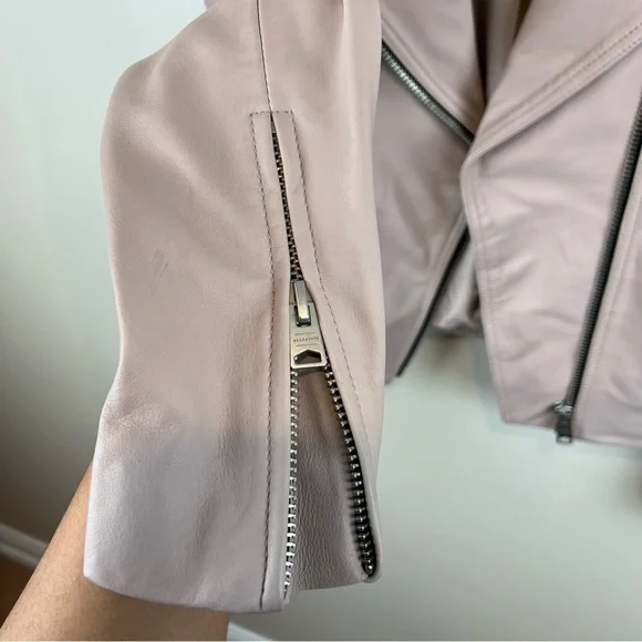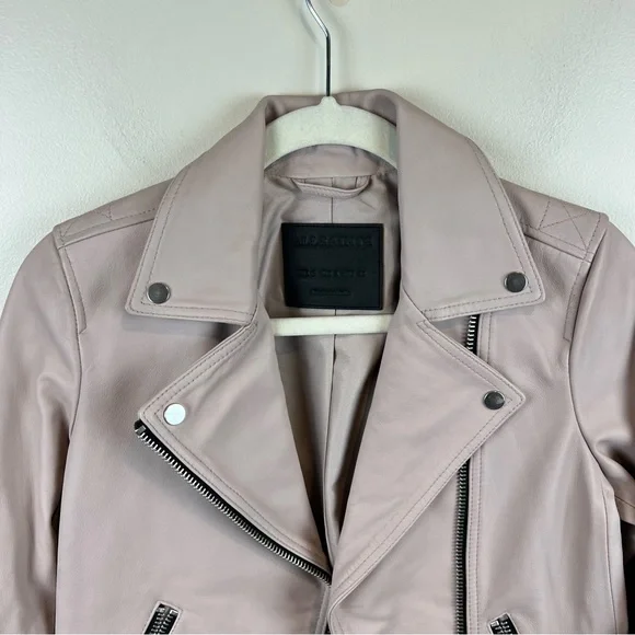 NEW ALLSAINTS Dalby Leather Biker Jacket in Nude Pink, Size 2. New without the tags. Some minor imperfections on sleeve and 2 tiny holes where the tag was placed by the armpit area (see last 3 photos). Discounting for those flaws.Self: 100% sheep leatherLining: 100% polyProfessional leather clean onlyFront zipper closureZipper pocketsZipper gusset sleevesImported