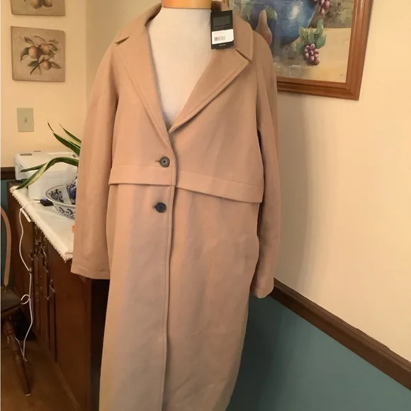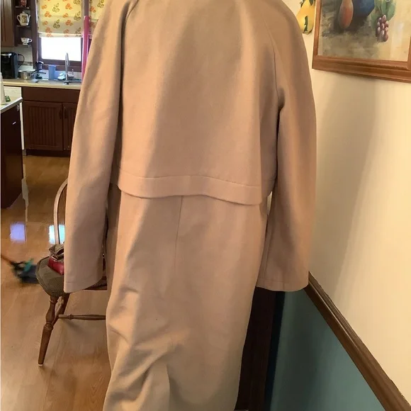 This trench style coat features 2 buttons. It is 70% wool and 30% polyester. It has 100% polyester lining. Pit to pit measures 23” and length is 45”. Thanks for looking!