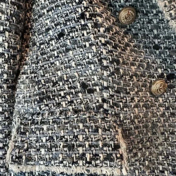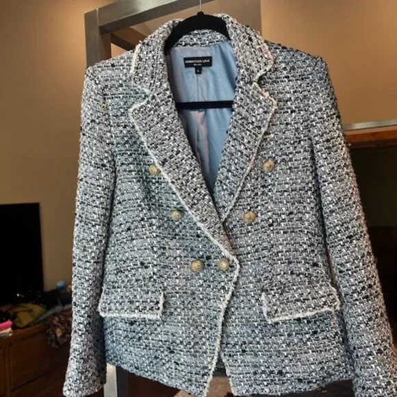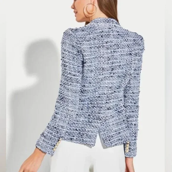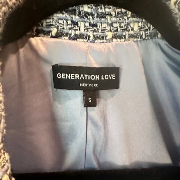 Eliza Tweed BlazerNavy blue shimmer threads! Called Blue Melange. Only worn twice! This is extremely comfortable and fits true to size. Sale price$445.00Color:Blue Melange (with Metallic threads) Crafted in sky blue tweed with a hint of metallic shimmer, this blazer features a modern mid-length silhouette, a double-breasted design, and fray detail. A contemporary take on a timeless classic, it’s an essential addition to your spring wardrobe. Generation Love tweed is crafted with recycled fabric, imported from Italy.44% Cotton / 37% Acrylic / 11% Nylon / 6% Polyester / 1% Viscose / 1% Metallised PolyesterLining: 95% Polyester / 5% ElastaneProfessional Dry CleanRegular Fit2 Functional Waist Pockets 1 Functional Chest PocketLength: 24 1/4", Sleeve Length: 24"Model wears: US 2/XS / UK Check out this similar item for more details: https://www.neimanmarcus.com/p/generation-love-eliza-tweed-blazer-prod278530030?pimId=401255121685&utm_source=google_shopping&ecid=NMCS_GP_NC_DCCO&gad_source=1&gad_campaignid=12441927028&gbraid=0AAAAADuOtTdSe1TliY6Bd-qk2b9akOWSp&gclid=Cj0KCQjw953DBhCyARIsANhIZoZGTSsQHk6pdEzddP5lxqOiBo-L5U96WpjOFma3K7bxgsrnpDwXBAUaAhFkEALw_wcB&gclsrc=aw.ds