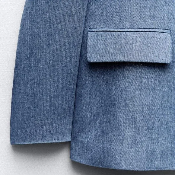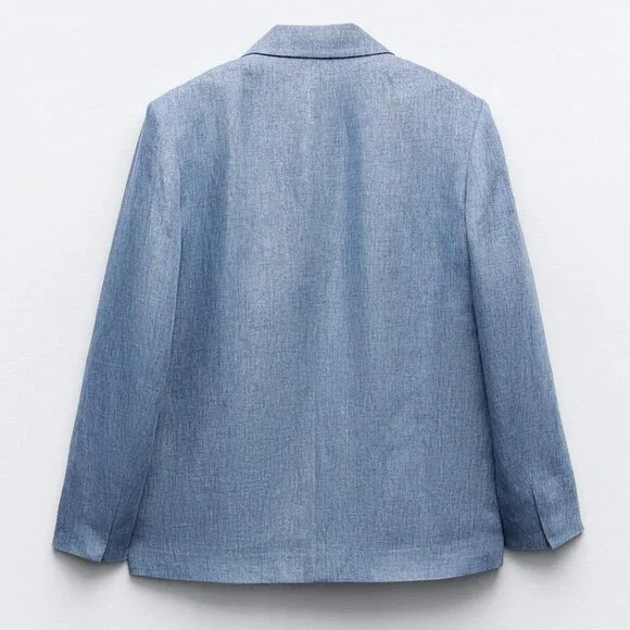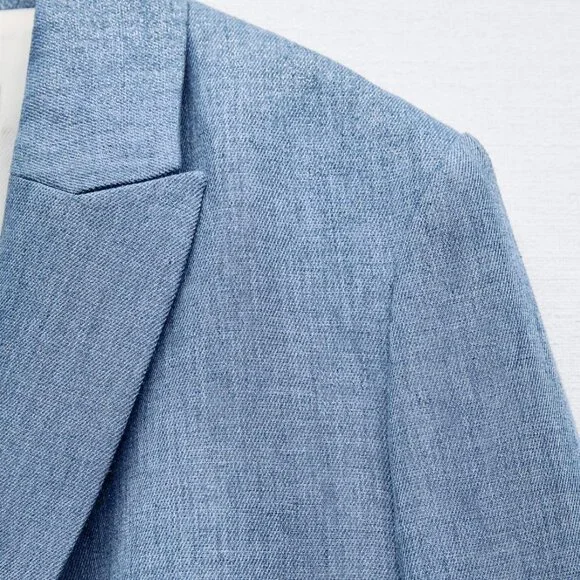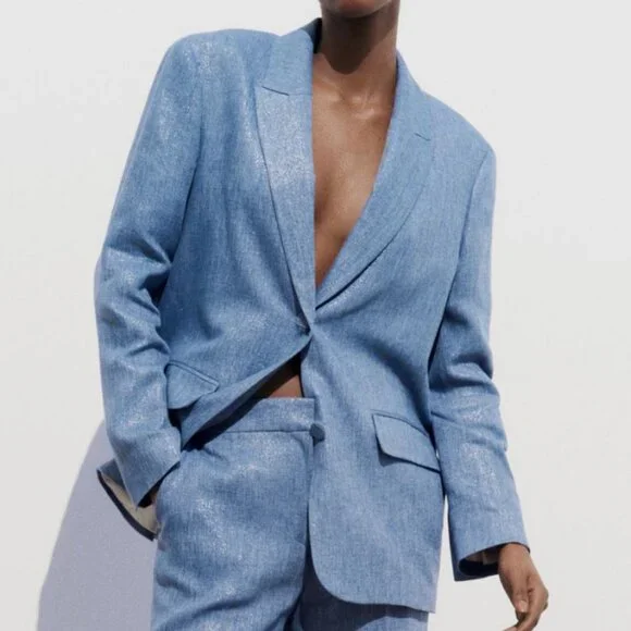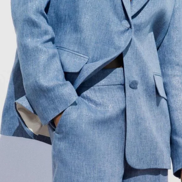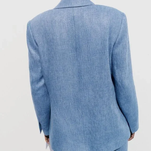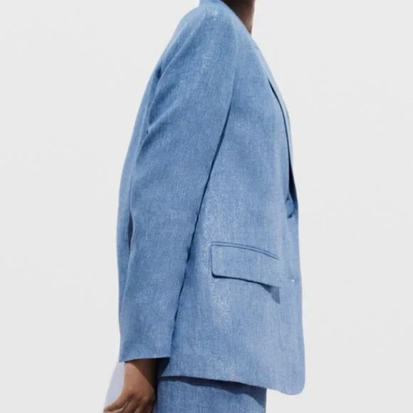 NWT Blue Shiny Jacket w/ Shoulder Pads, MBrand New Shiny Fabric Jacket in Blue, MLong sleeve jacket w/ lapel collar, shoulder pads, front flap pockets & shimmer fabricTonal-lined buttons frontal closureMixture of polyester (50%) & linen (50%) W/ 100% acetate liningThanks for looking!!!