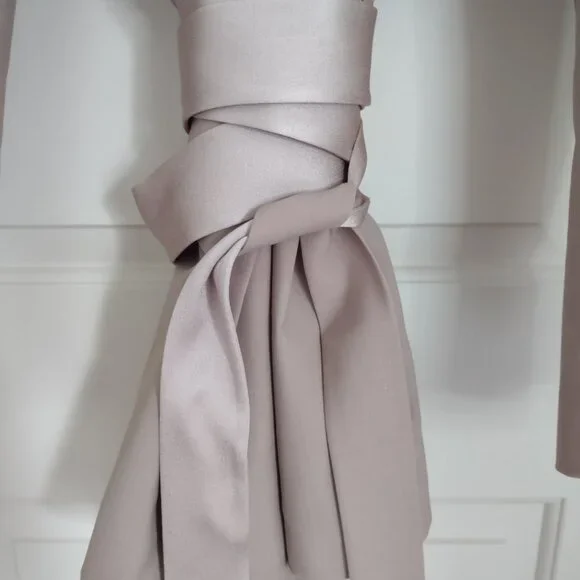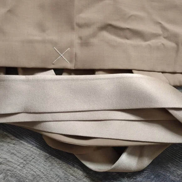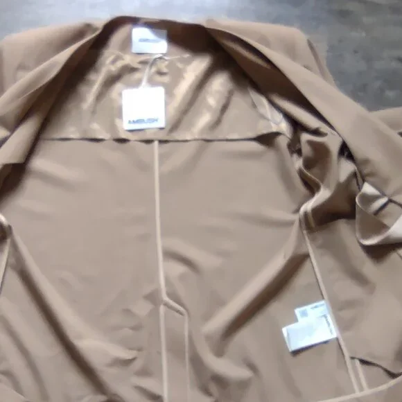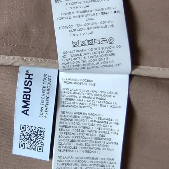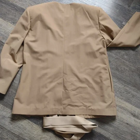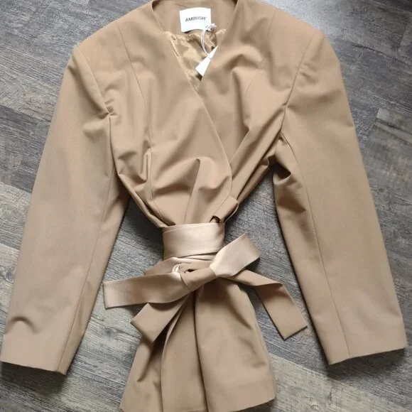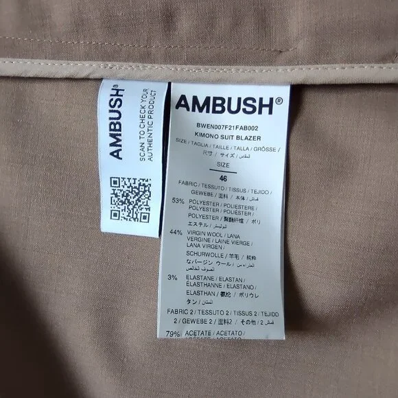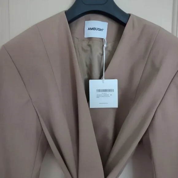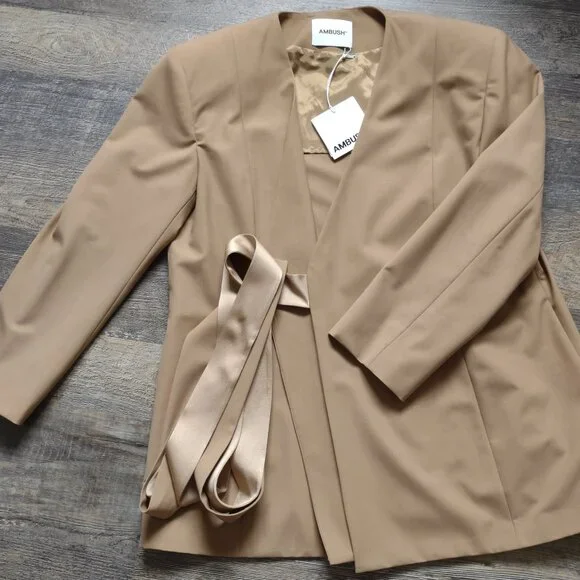 New with Tag - Handmade in Italy - Kimono Suit Blazer in Natural Tan color by Ambush, Size 14-US, 46-EU.There are 2 side/slit pockets & 2 inside pockets (which can be used to store the belts in when not wearing it). This jacket has 2 matching fabric belt ties at the waist that are inserted into the slits & wrap around to form a bow. One of the belts is a contrasting color & fabric, satin-like, the other belt matches the fabric. Materials=Polyester, Virgin Wool, Elastane. The care & fabric info are attached by garment tag & the Designers info tag. Measurements: Shoulders=20";ptp=23";Arm length from shoulder=23";Arm length from pit=16"; Jacket Length=30"Condition: NewNote: the 1st photo is a photo from the store´s website. The remaining photos here are the actual photos of this jacket. This was purchased by one of my family members while visiting Italy.At the time of listing this jacket I found 2 sites from UK & Italy that still have this jacket available as new. One has a list price of $622 & the other site has it listed at $1022Eu.