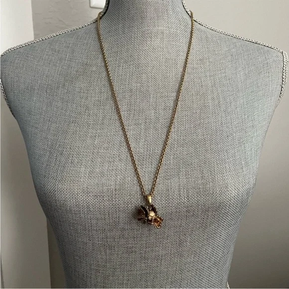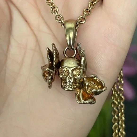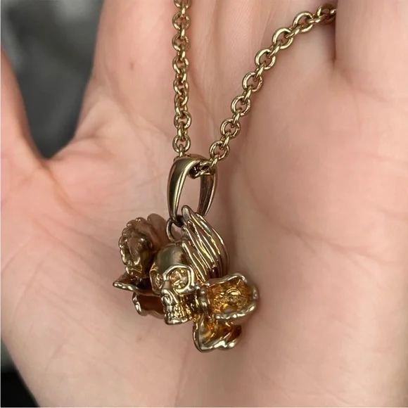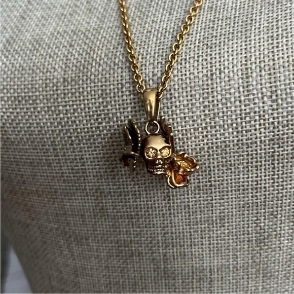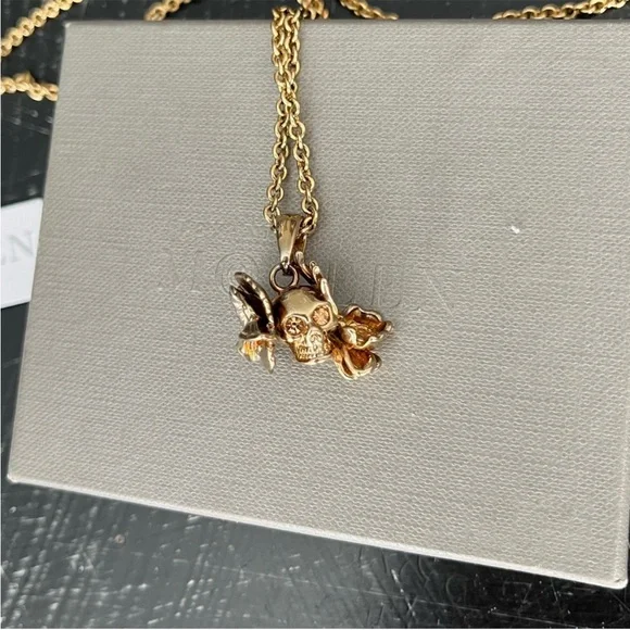 Authentic Alexander McQueen Necklace.Flowers and a wing adorn the signature skull in this Lovely pale gold toned detailed piece.Vintage. Rare.