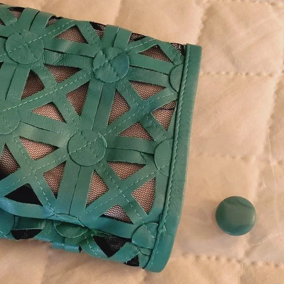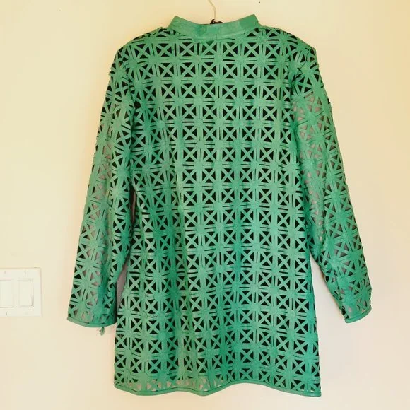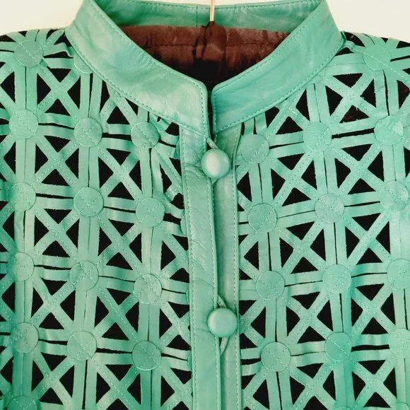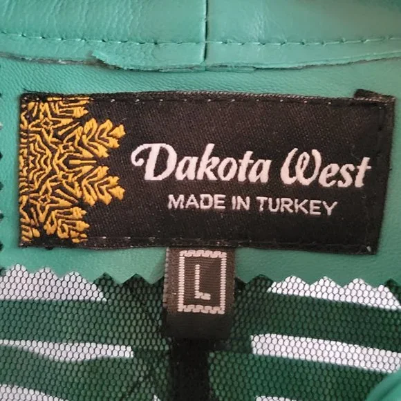 Dakota West Leathers creates unique leather jackets.***MSRP:$345.00*** These awesome stylish jackets are made in Istanbul, Turkey and all are made of genuine Turkish lamb skin which is one of the softest leathers in the world.They are handmade and hand cut and sewn onto a stretch of high quality Black lace mesh fabric which is transparent (see through).These photos are taken on a White background, but you can change the look depending on the color of item worn underneath. Dakota West prides itself on creating quality unique items that can be enjoyed through every season. Depending on the size of the jacket it weighs around 200 grams, making it extremely light weight-and when folded properly takes minimal space when travelling. Green Leather,Classic Window Button Style.Leather Buttons Front. Size: LARGE. MEASUREMENTS:Back 15".Chest 20".Waist 21".Sleeve Length 23".Jacket Length 32". A good way to determine if this jacket is your size simply button/zip closed one of your existing non-stretch jackets that fits properly, lay it on a flat surface and measure it in the Back, Chest and Waist areas as shown by the pink arrows on the 3 sizing photos