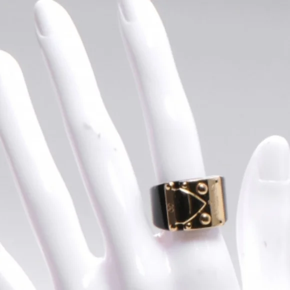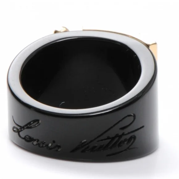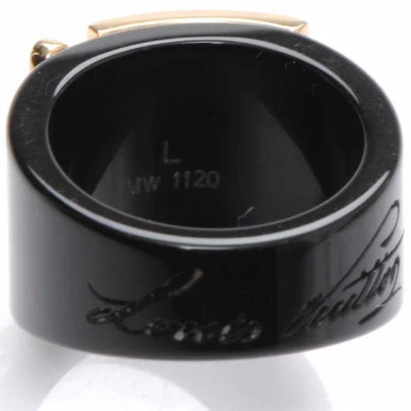 This is an authentic LOUIS VUITTON Lock Me Ring 7.5 L in Black. This ring is black resin with a brass Louis Vuitton faux press lock on the front and an engraved Louis Vuitton signature on the rear. This is a marvelous ring with the look of luxury and style only from Louis VuittonMarked Louis Vuitton Paris, signature on the outside of the ring and model number insideRing size 6.5Weighs 7 gramsNo tradesGuc
