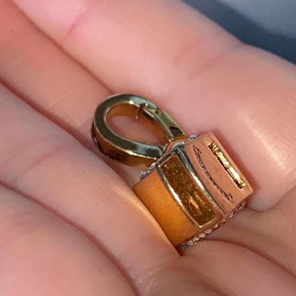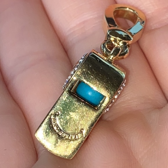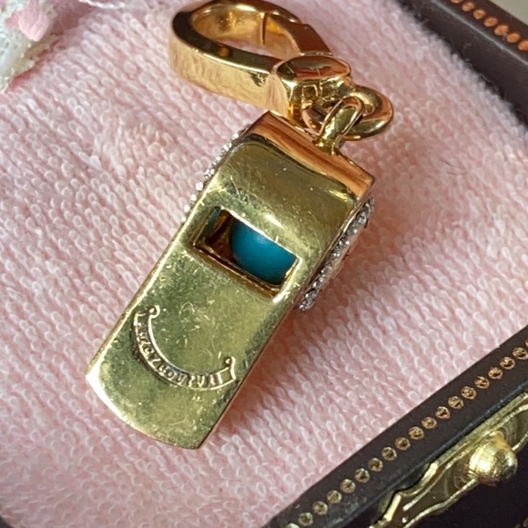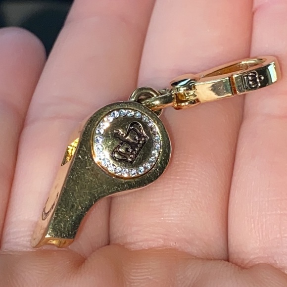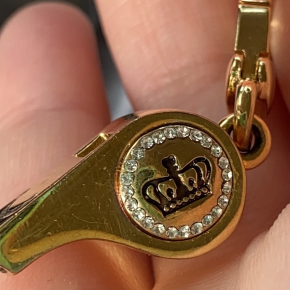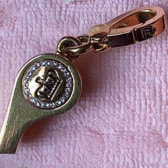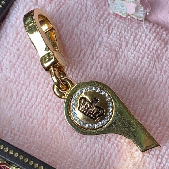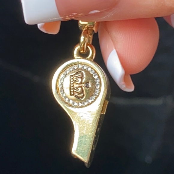 Gorgeousexcellent preowned condition Very Rare Juicy Couture Gold tone with pave crystals rhinestones adorn this gorgeous whistle with gorgeous crown and Juicy couture engraving! Whistle actually makes noise when you blow in it, I have not blown through it but a friend who has one told me it does make sound!This charm is hard to find with all rhinestones in tactI have never worn this charm, kept stored in a box for admiration onlyAll crystals rhinestones in tactBlue ball visible through whistle opening!