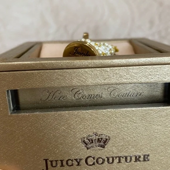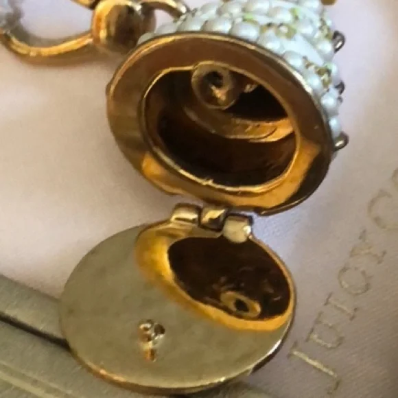 Juicy Couture WEDDING CAKE Charm Pearls Dove HERE COMES COUTUREWhite 3 TIER Wedding cake surrounded by white pearls and topped with a white dove!!! With original gold box that says here comes Couture!!Bottom opens to reveal a little compartment... that says “JUICILY EVER AFTER” bottom is a bit tarnished due to it’s vintage and storage....Perfect for any Bridal wedding anniversary presentEngagement giftWedding giftAnniversary giftLoveCoupleMarriedBrideGroomRae Dunn