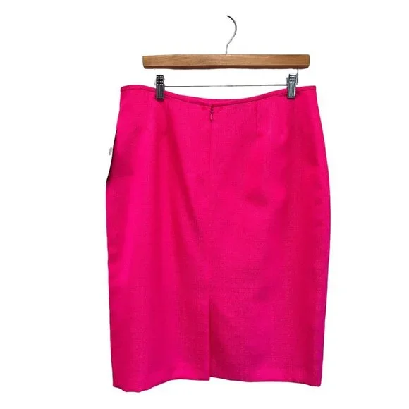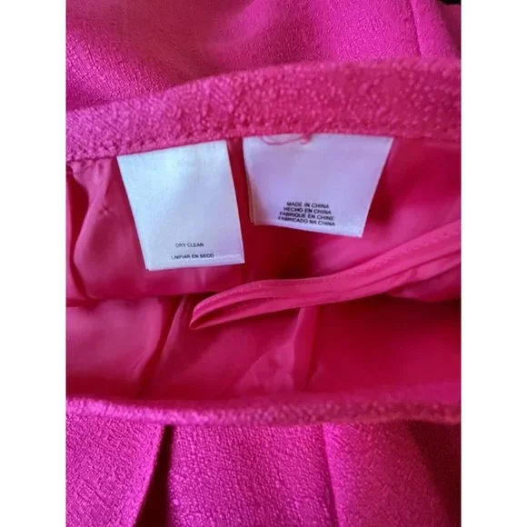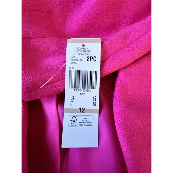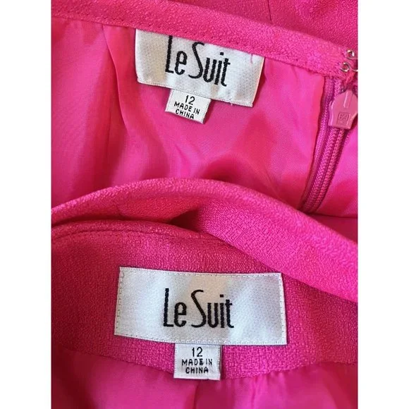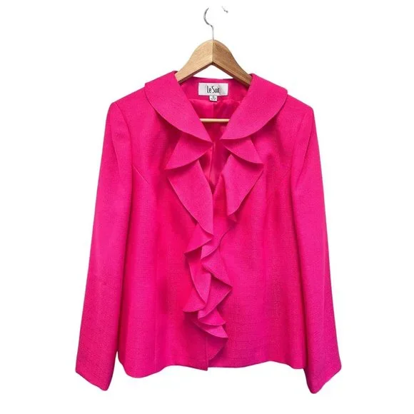 Le Suit Rose Garden Carnation Barbiecore Pink Ruffle Skirt Suit Outfit 12 NWTReally gorgeous.Button front blazer with ruffle down the front, matching skirt with flat waist and zipper up the back.Both pieces lined.Fabric has no stretch at all.JACKETBust 43 inchesWaist 38 inchesHips 43 inchesShoulders 16.5 inchesSleeve length 24 inchesLength 23 inchesSKIRTWaist 33 inchesHips 44 inchesLength 25 inchesWalking slit 7 inchesAll items are guaranteed to be authentic and as-described with no undisclosed flaws, damage, or excessive wear.My home is both smoke-free and perfume free.