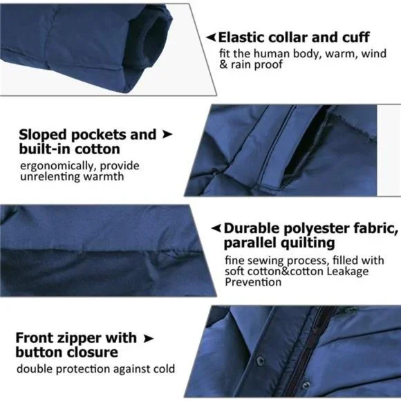 Double styles: Classic Hooded Style: Removable hooded with faux fur trim, excellent for colder winter days.The hooded with faux fur trim is easy to attach and detach, and the faux fur does not shed. Removing the hooded with faux fur trim is another style. Big and deep hood with beautiful color trim. High quality, smooth, soft,no allergic artificial fur, classic winter colors, complement the winter. Our artificial fur is connected to the hooded and can be removed from the clothes by a zipper.Size & colors: XS/S/M/L/XL/XXL in 7 colors. Size of the winter jacket is perfectly designed for Americans, fits the body much better. The length of this cotton garment right covers the fat at your waist, hip & thigh and makes you look tall & slim. Notes: Pls refer to the size details picture on the pics and use similar clothing and the Q&As or buyer comments to compare with the size. Long woman slim design thickened jacket with charming S Shape figure will make you more charming & elegant.Pockets & cuffs: 3 Pockets: two deep outer side pockets (The inside is warm cotton, not cold polyester, delicate care of your hands), and one interior security pockets great for keys, phones, and other valuables. Elastic knit cuffs keeping the wind from entering into the coat. Our jacket has developed for new high quality outer fabric: Windproof, and water repellent which will continue to insulate even when wet.